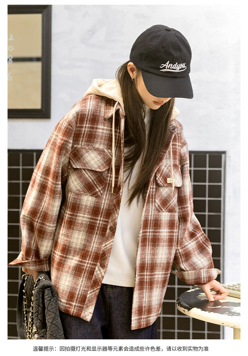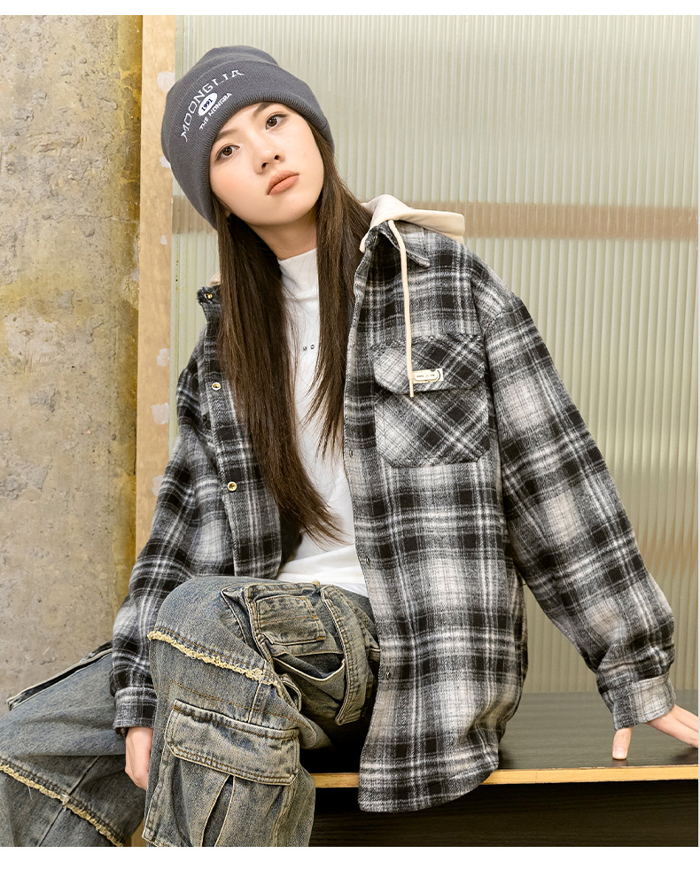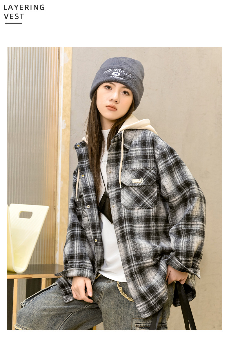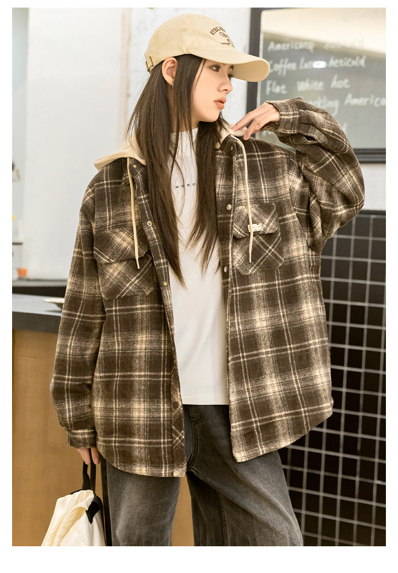 소녀들의 가을과 겨울 후드 체크 셔츠 2024 새로운 한국식 고등학생 면 탁상
