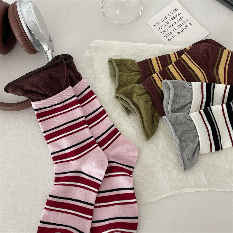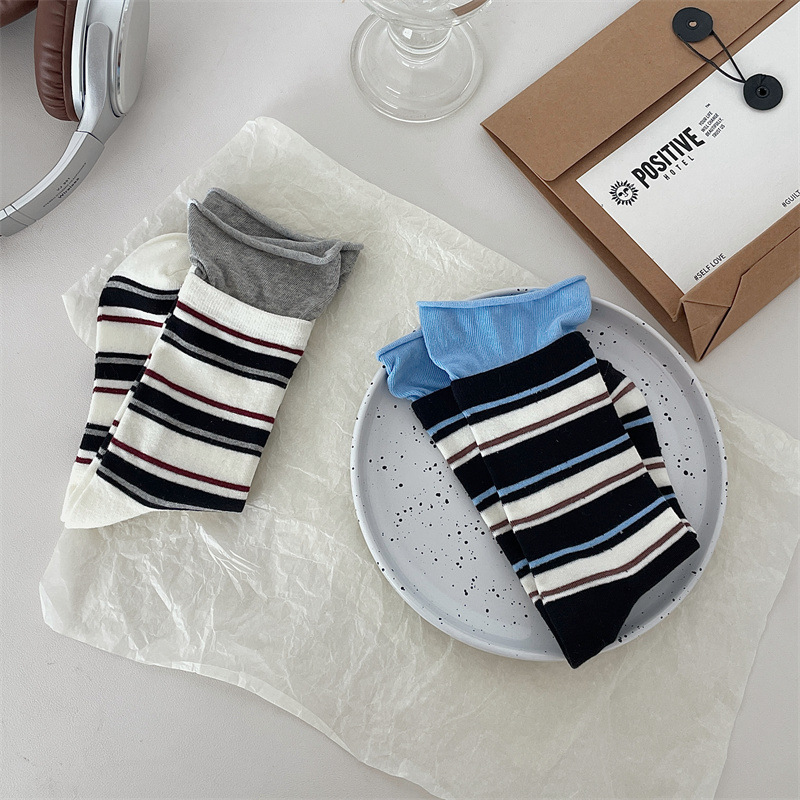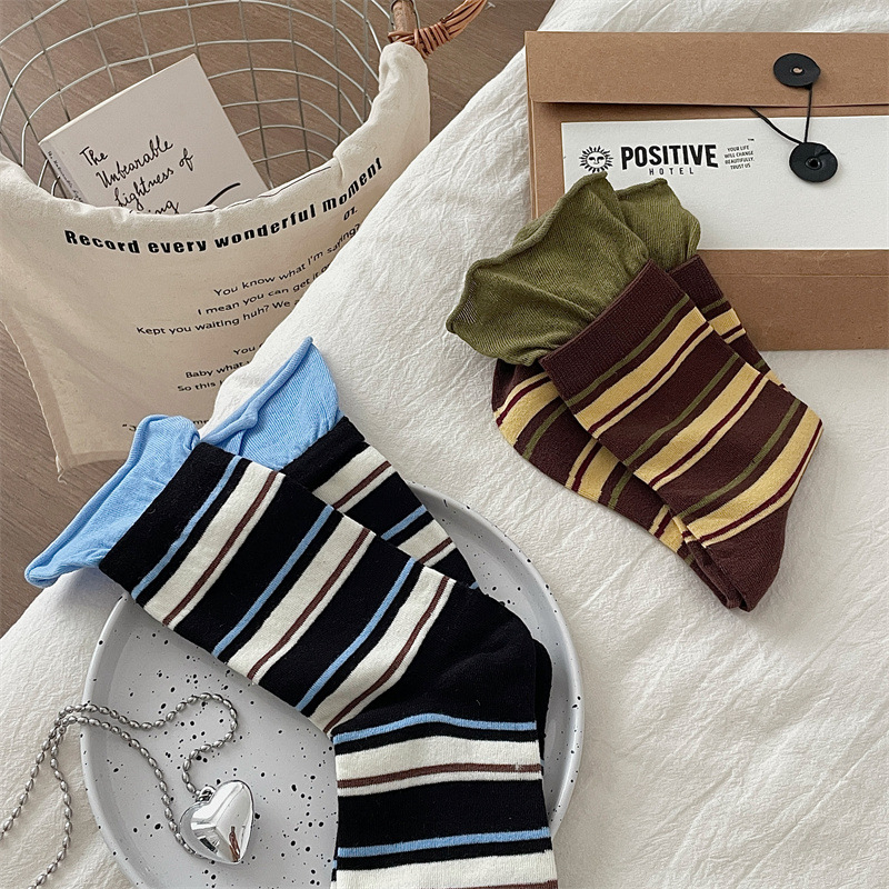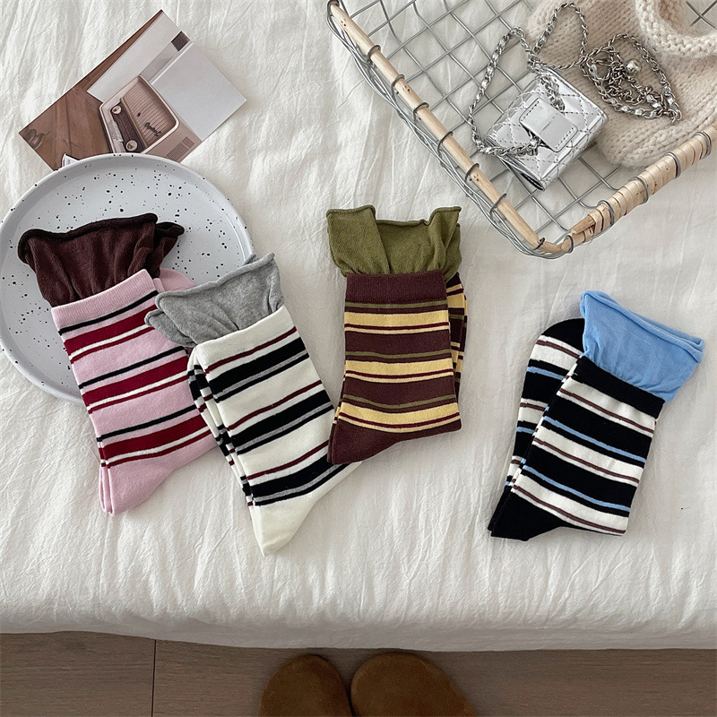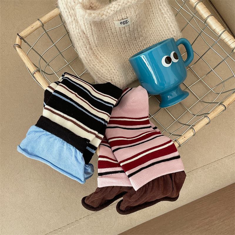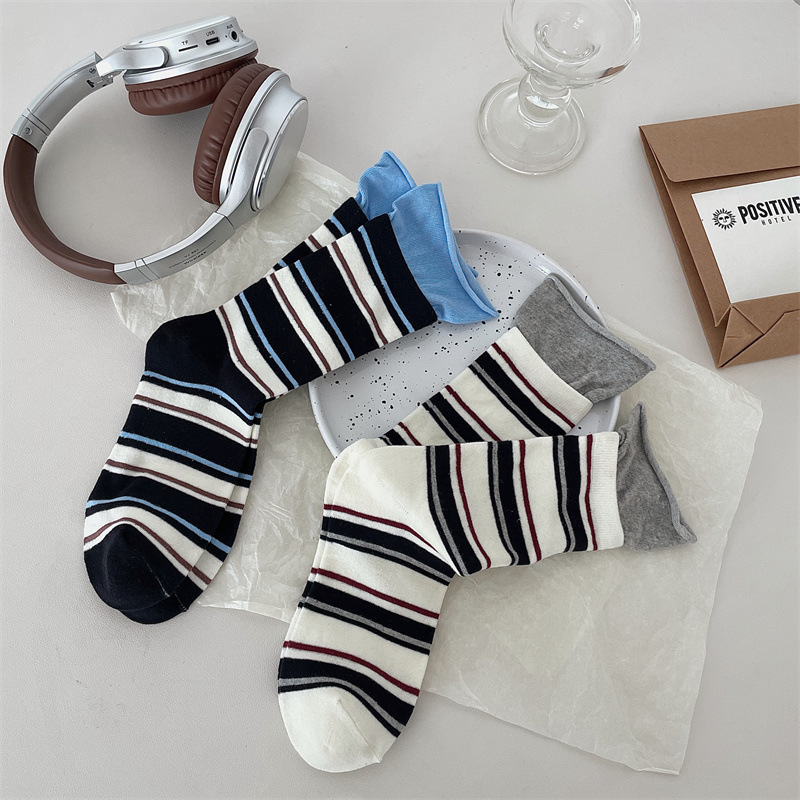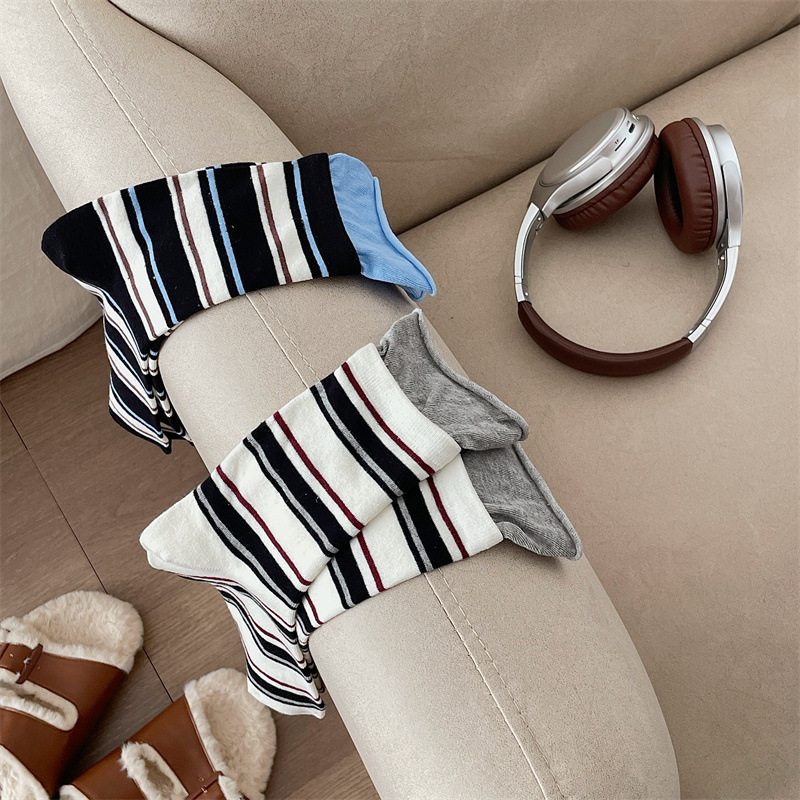 24 가을 새 스타일 양말 한국 스타일 느슨한 입 대비 컬러 스트라이프 여성 중간 길이 양말 스포츠 캐주얼 코튼 여성용 양말 통기성