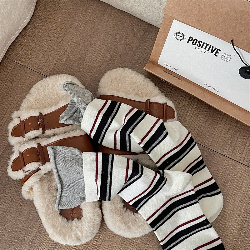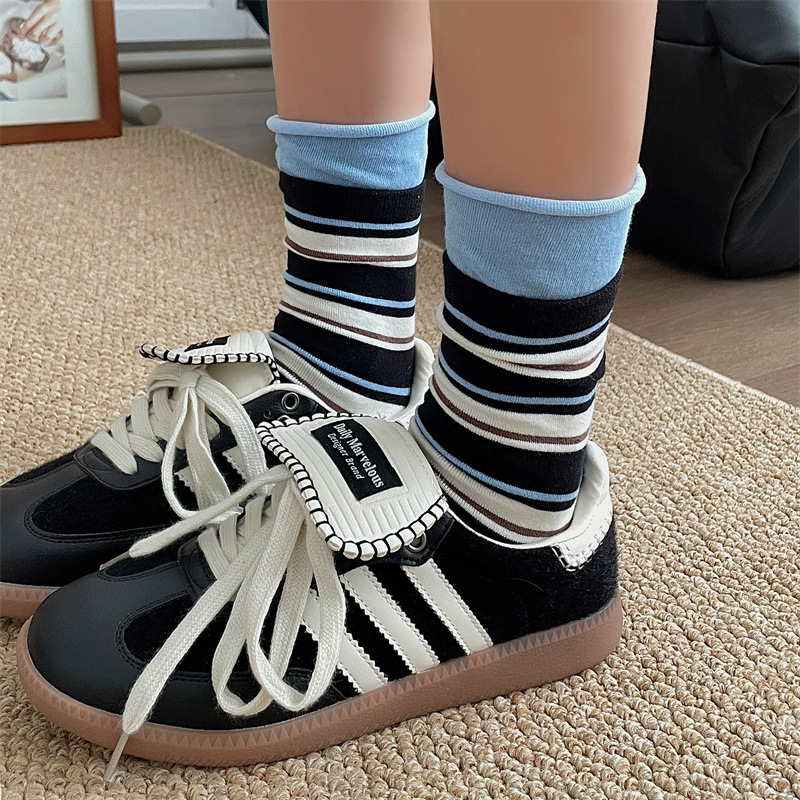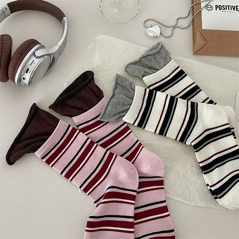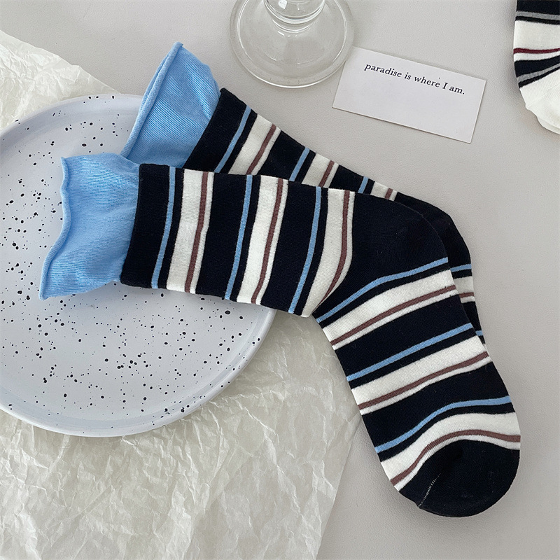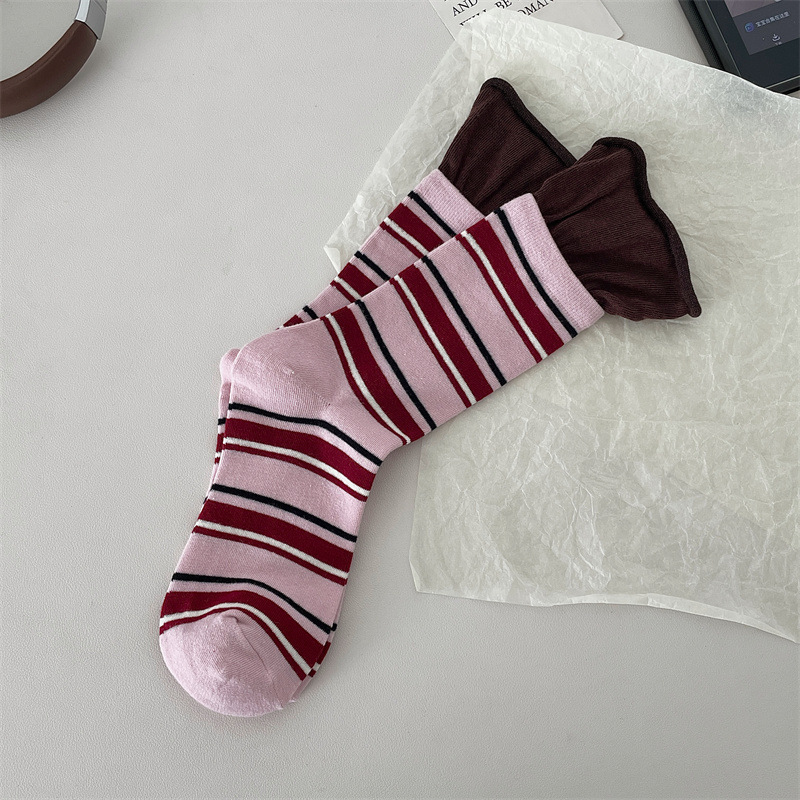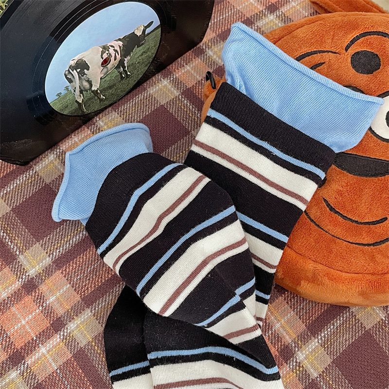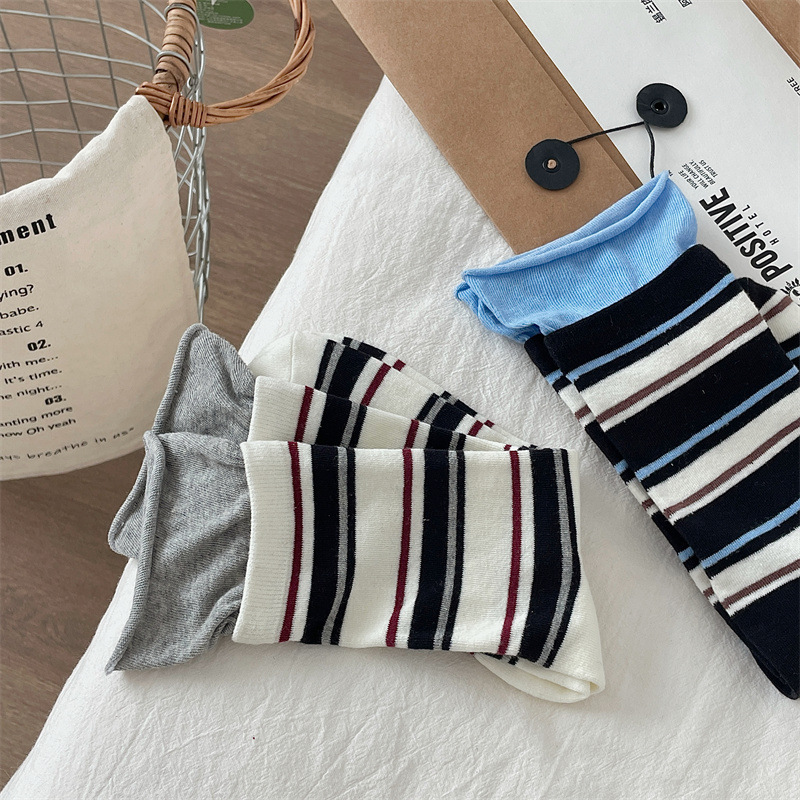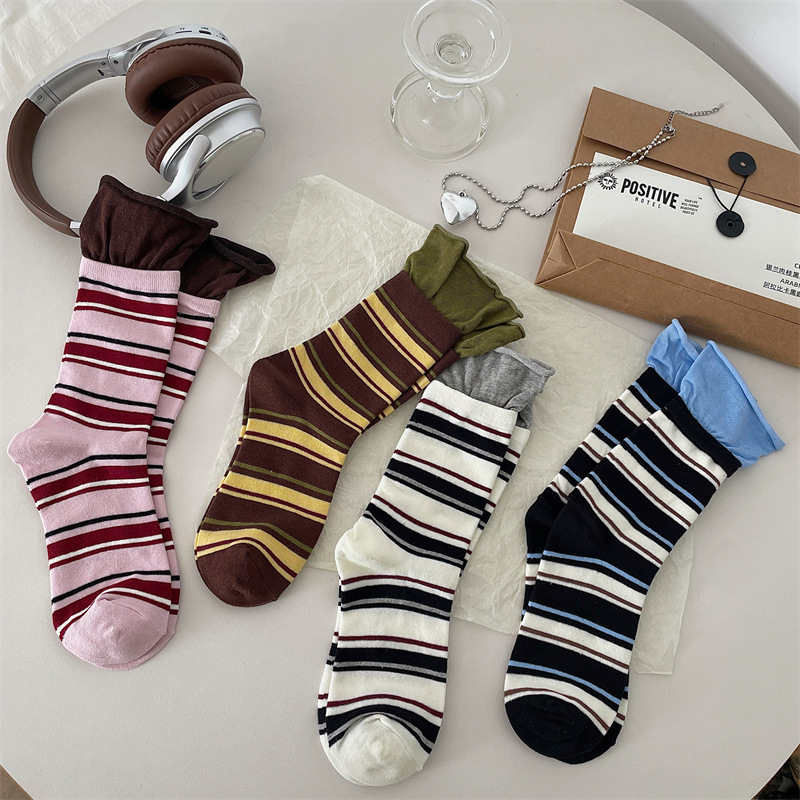 24 가을 새 스타일 양말 한국 스타일 느슨한 입 대비 컬러 스트라이프 여성 중간 길이 양말 스포츠 캐주얼 코튼 여성용 양말 통기성