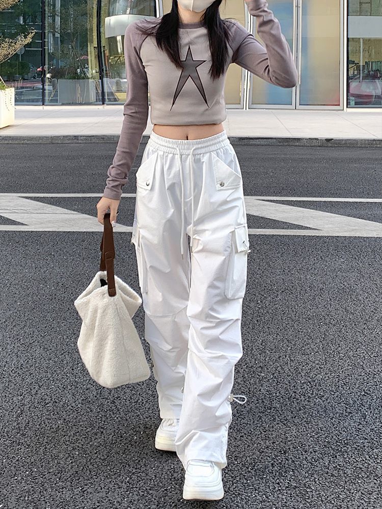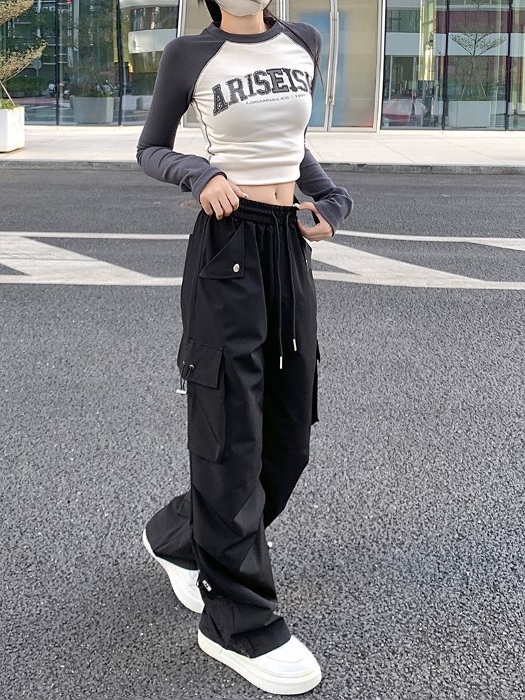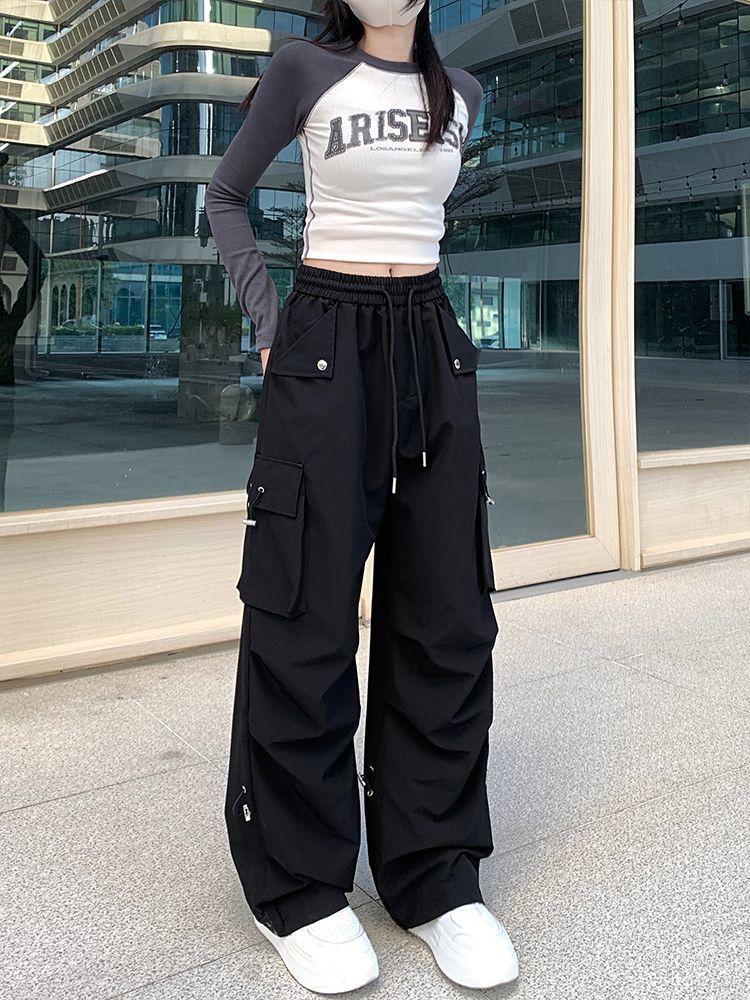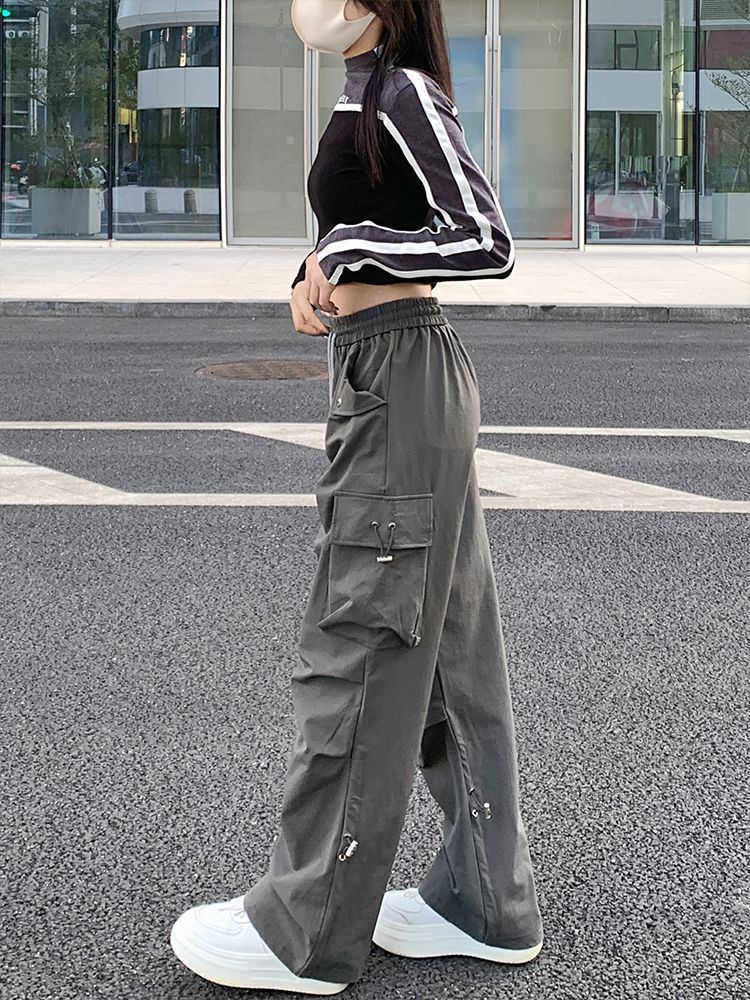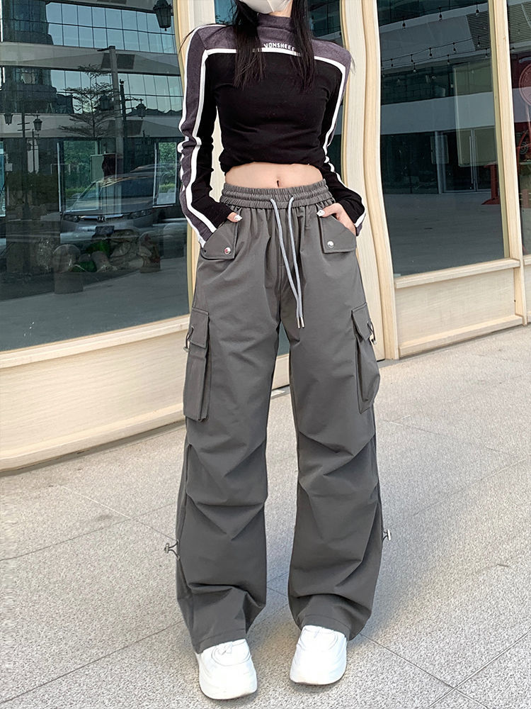 아메리칸 스타일 넓은 다리 낙하산 크레인 바지 여성 여름 얇은 높은 허리 느슨한 모든 경기 유행 충전 바지 캐주얼 긴 바지