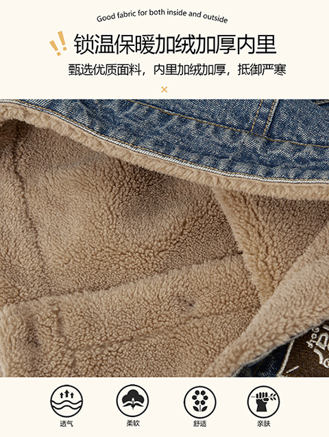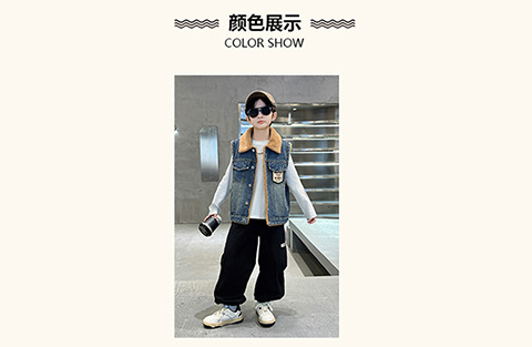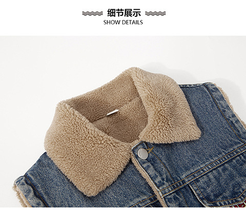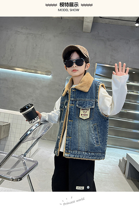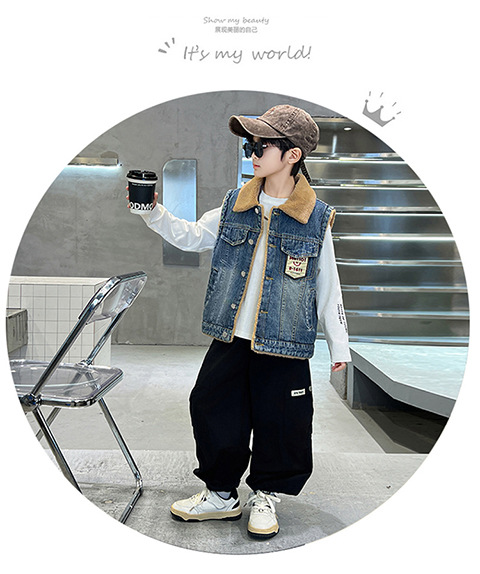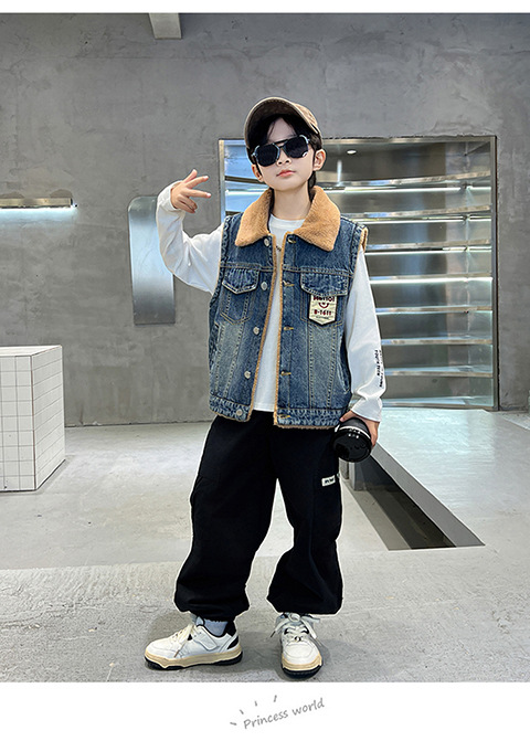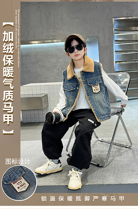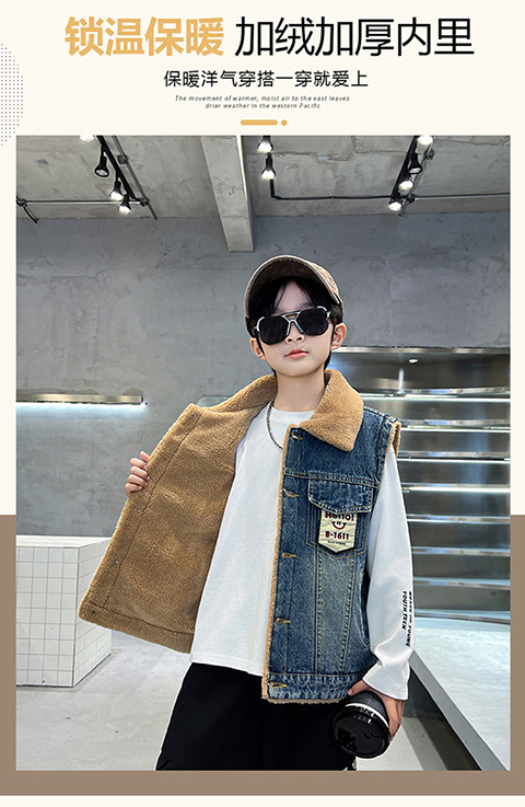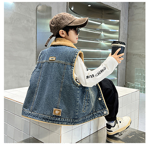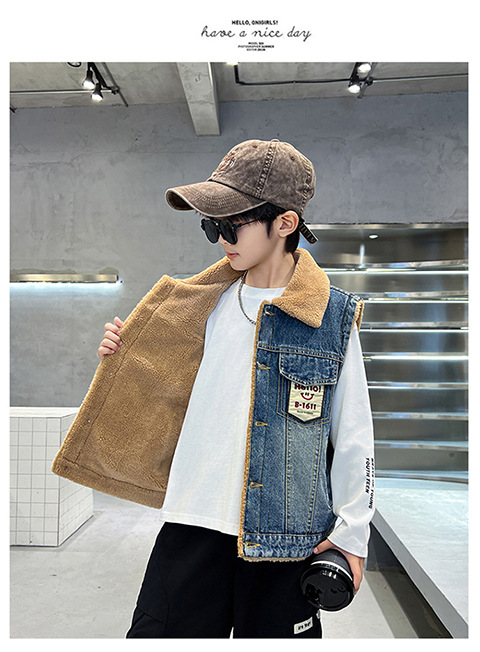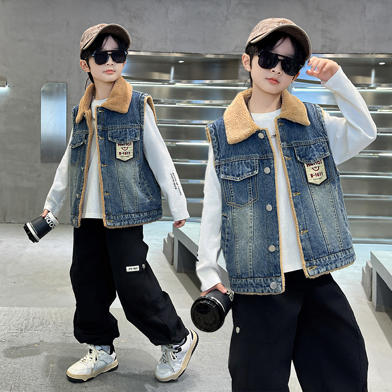 소년 조끼 겨울 두꺼운 2024 소년 조끼 한국 스타일 소년 조끼 유행 양가죽 데님 조끼