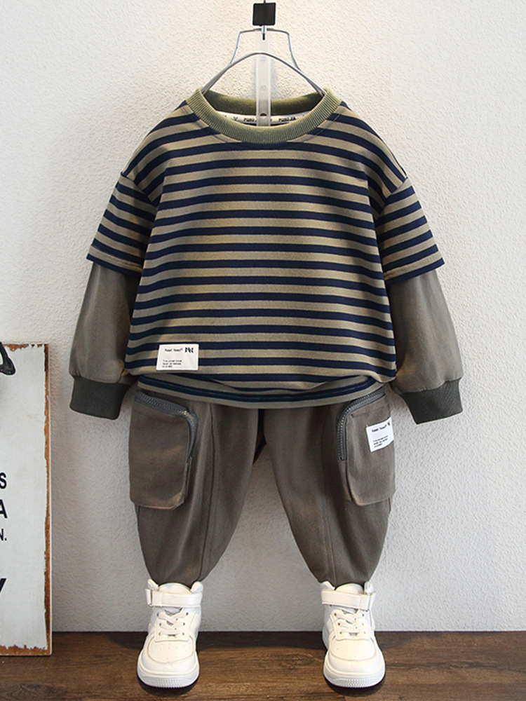 소년 가을 세트 어린이 2024 년 새 봄과 가을 아기 러피 잘 생긴 트렌디 스트라이프 스웨터 바지 투피스 세트