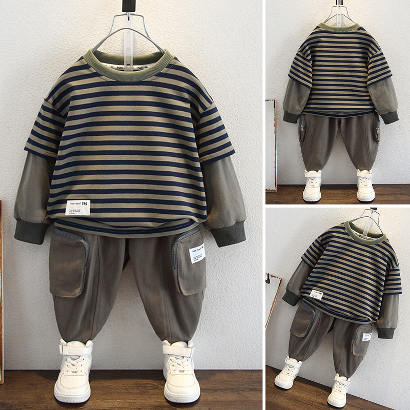 소년 가을 세트 어린이 2024 년 새 봄과 가을 아기 러피 잘 생긴 트렌디 스트라이프 스웨터 바지 투피스 세트스토어 가기