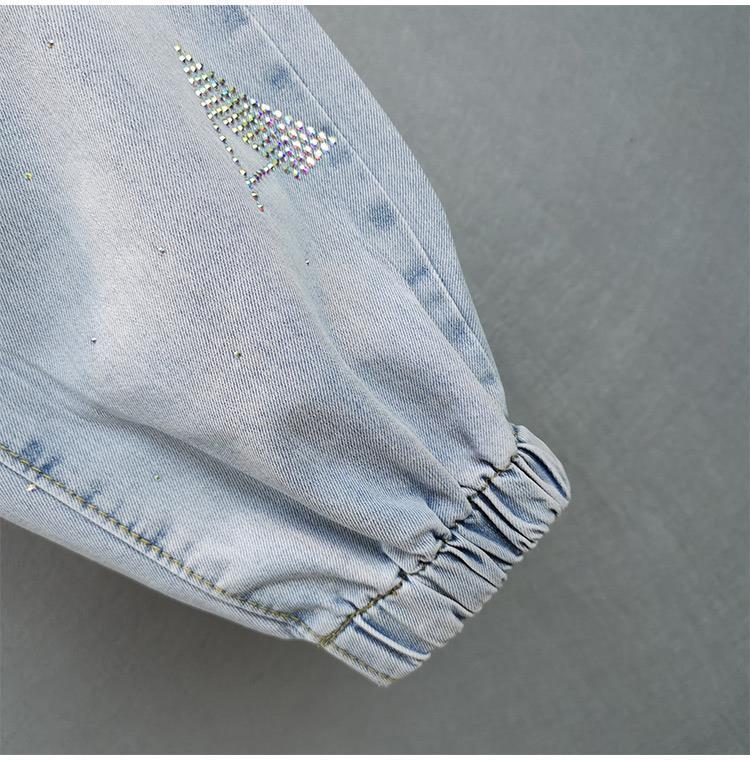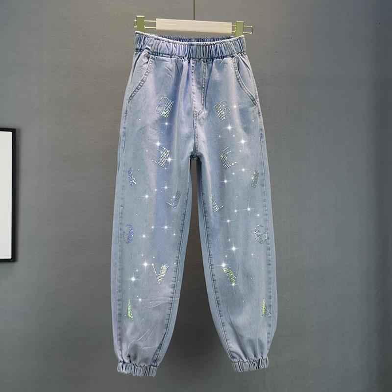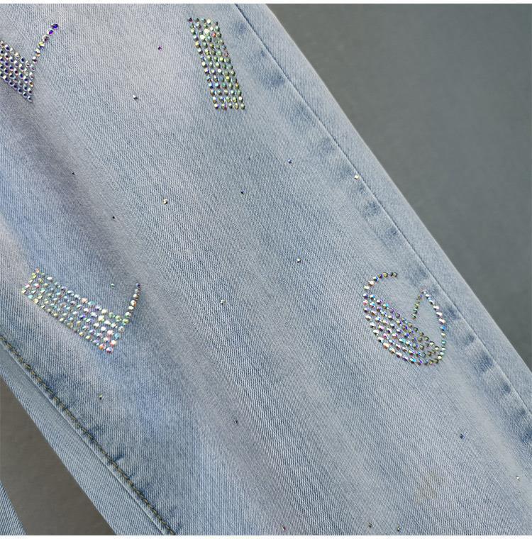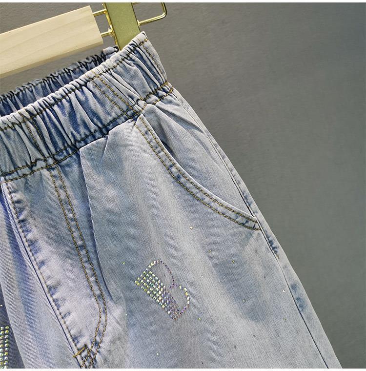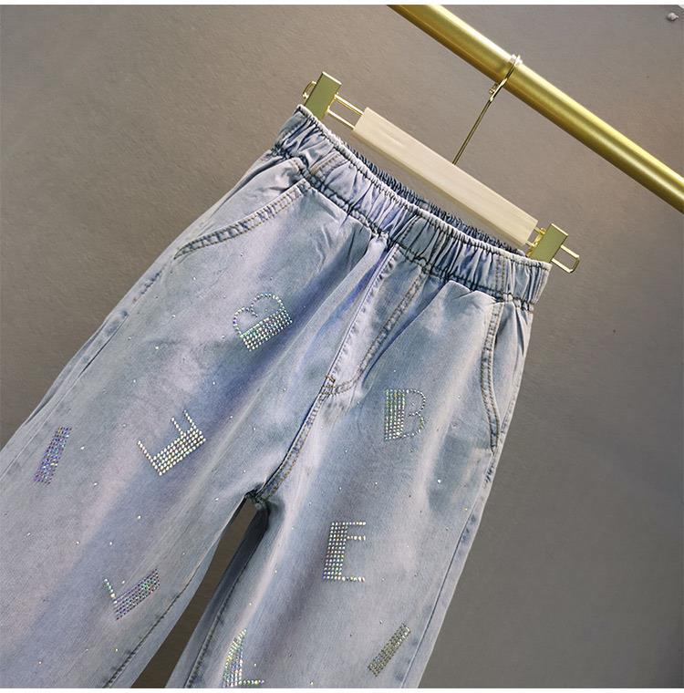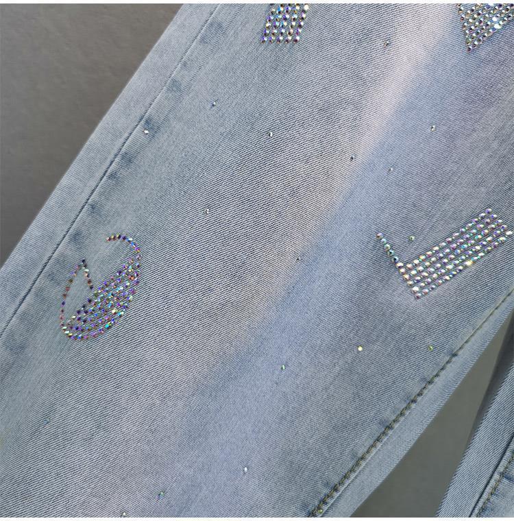 청바지 여성의 트렌디 2024 여름 새로운 도착 플러스 사이즈 유럽 역 느슨한 슬리밍 허리 컬러 핫 라인스톤 터프 바지