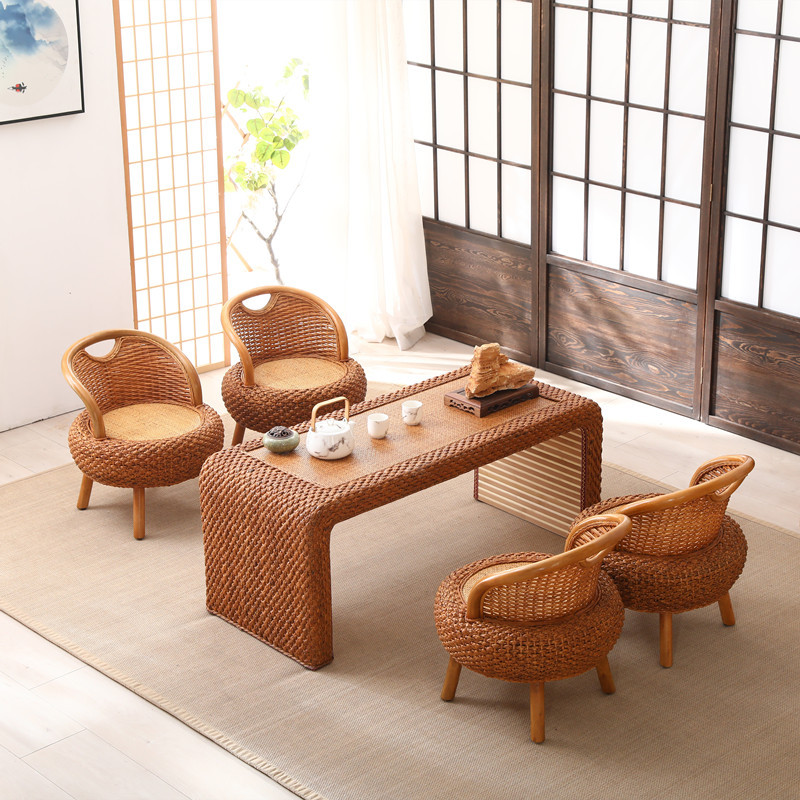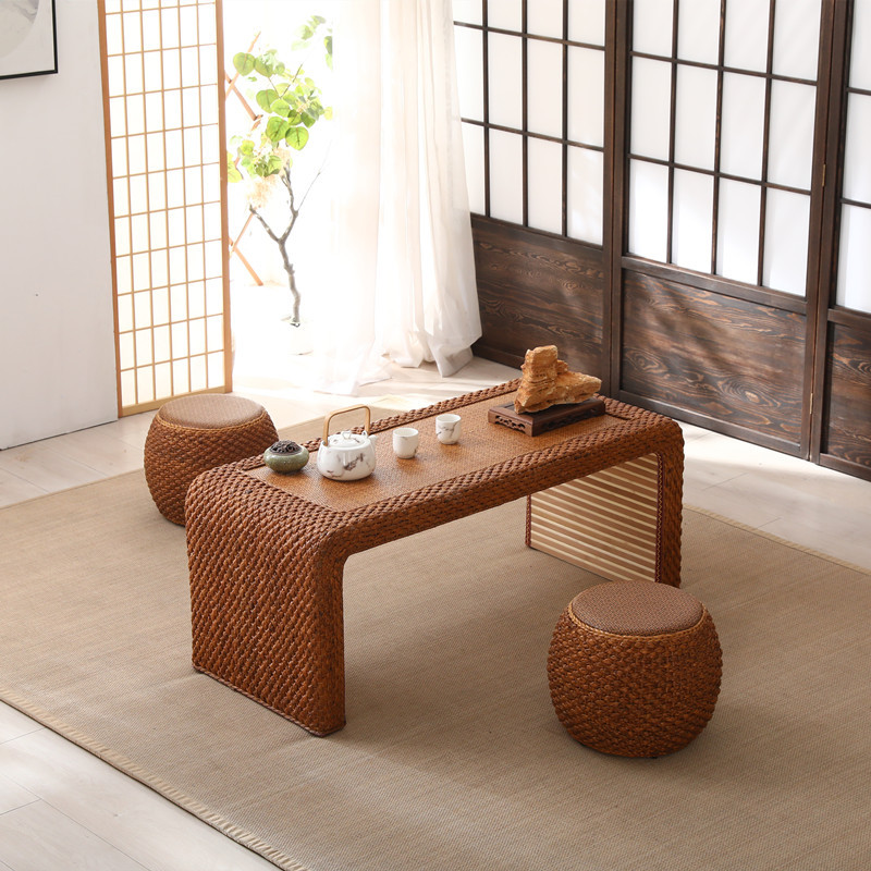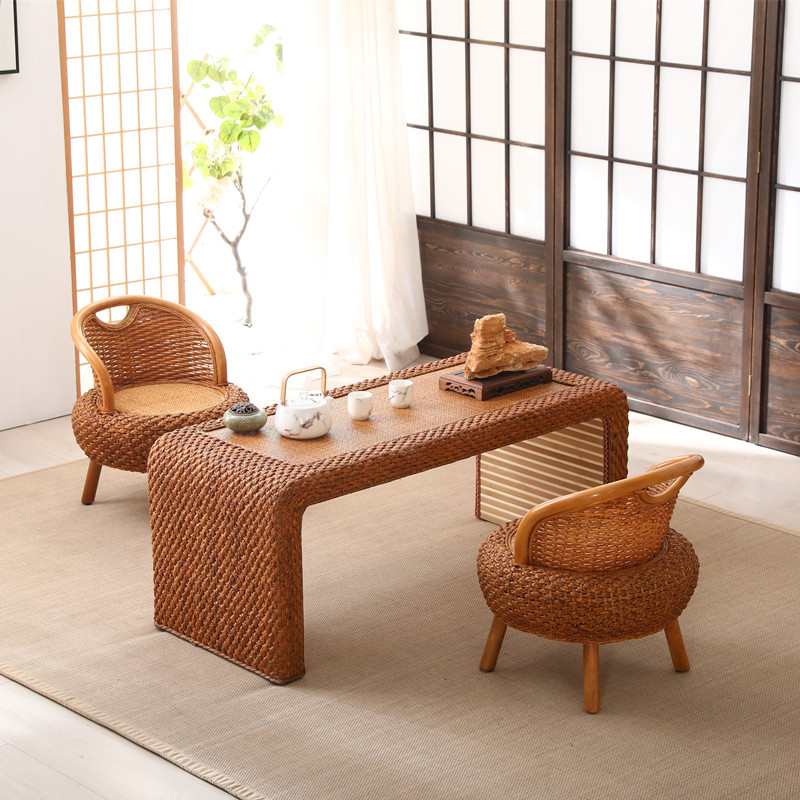 등나무 다다미 차 테이블 발코니 작은 테이블 일본 커피 테이블 야외 안뜰 테이블과 의자 조합 3 피스 낮은 차 테이블