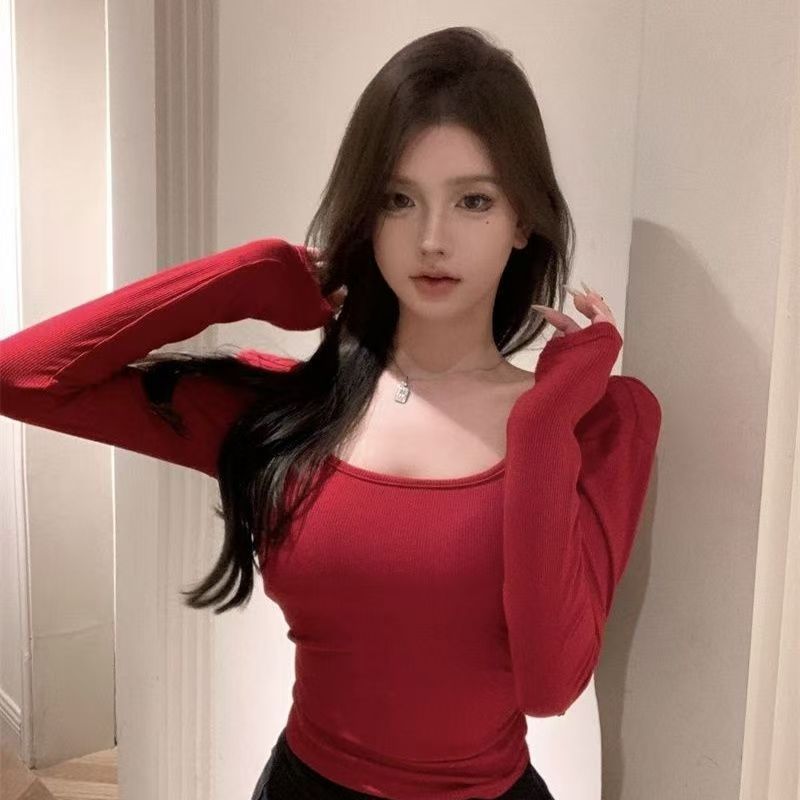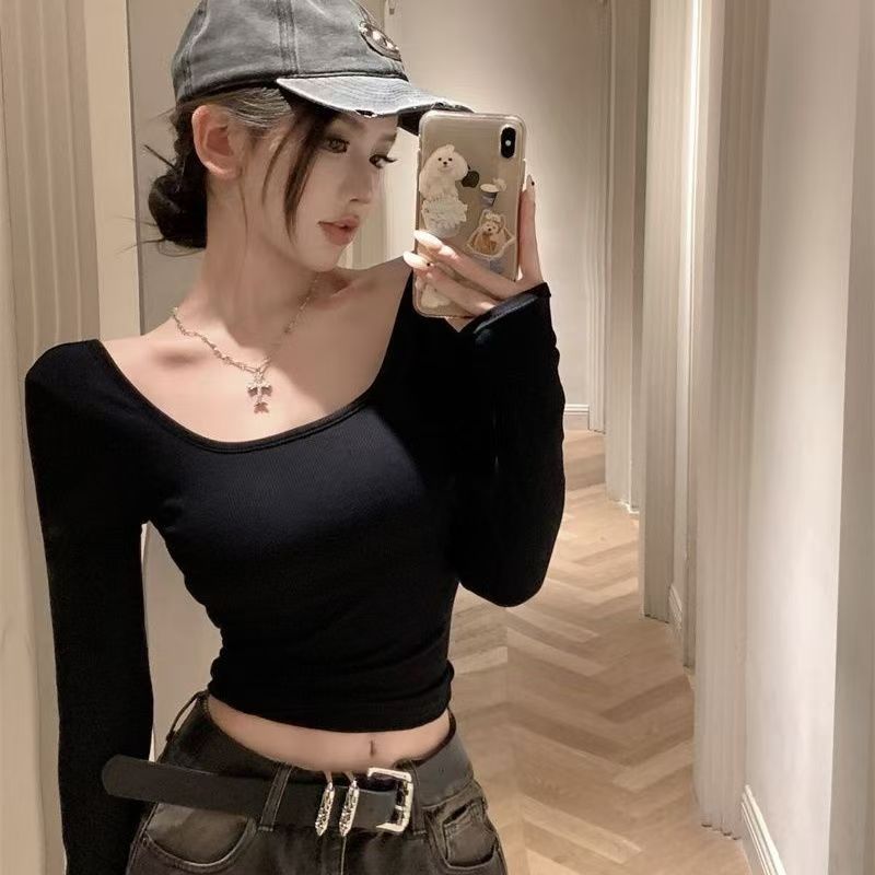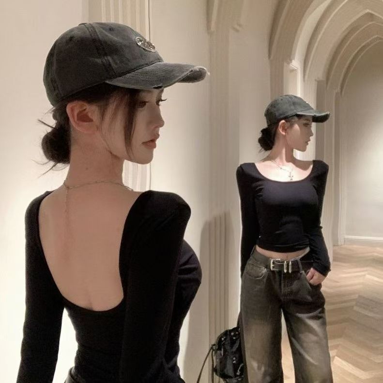 유럽과 미국 스타일 섹시한 백리스 긴팔 슬림 티셔츠 여성용 U-넥 타이트베이스 셔츠 슬리밍 방지 스트립 가슴 패드로 슬리밍스토어 가기