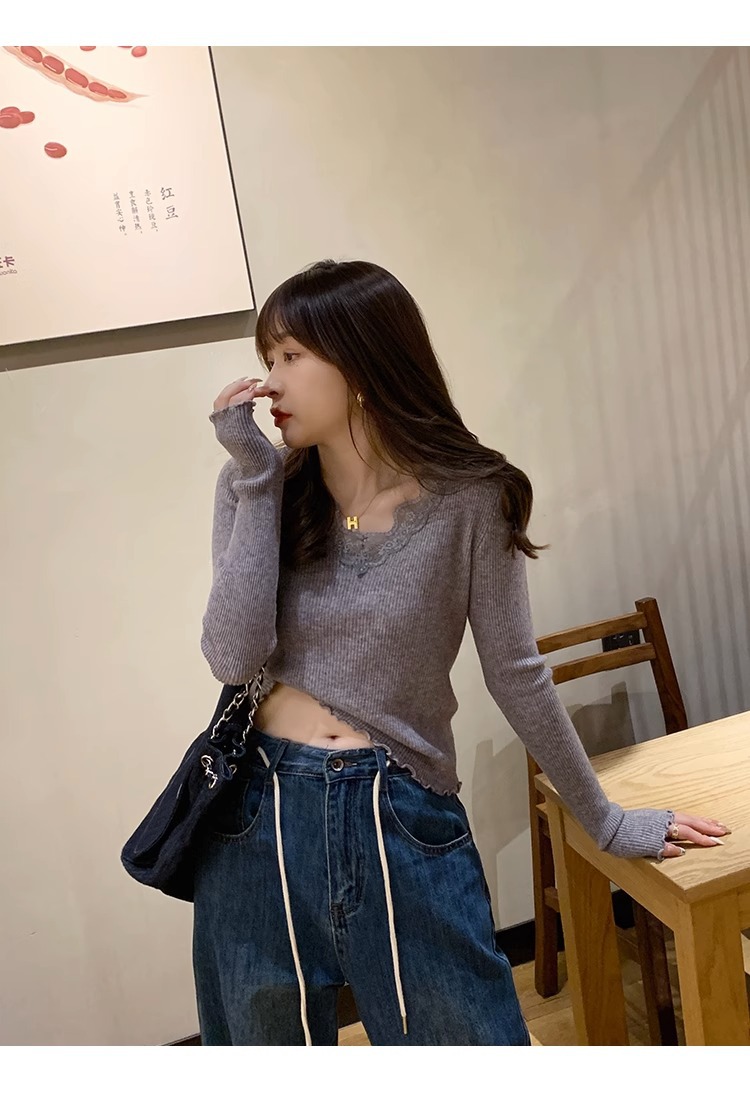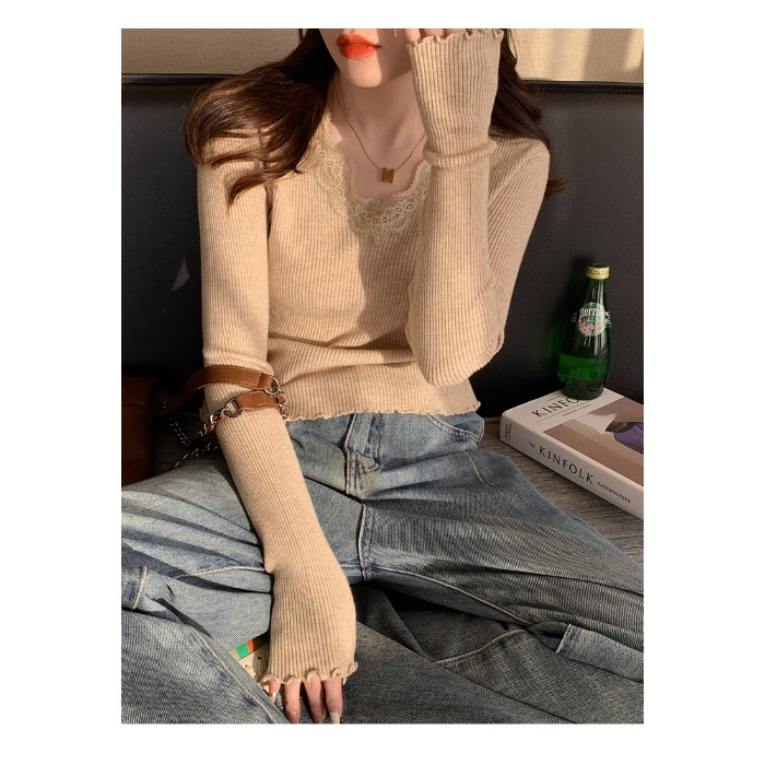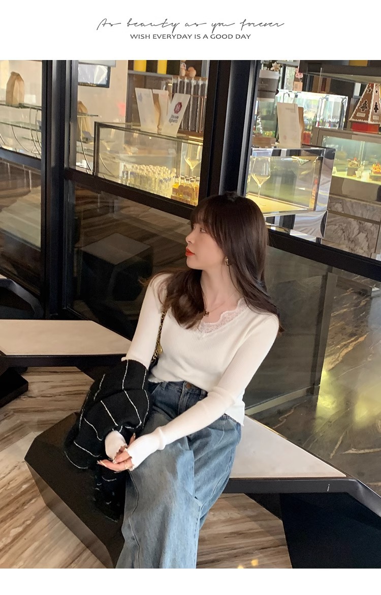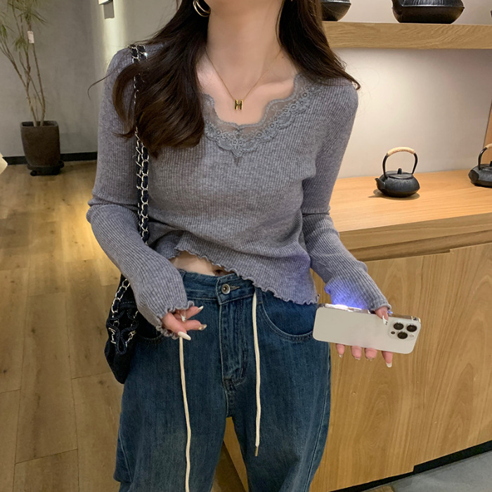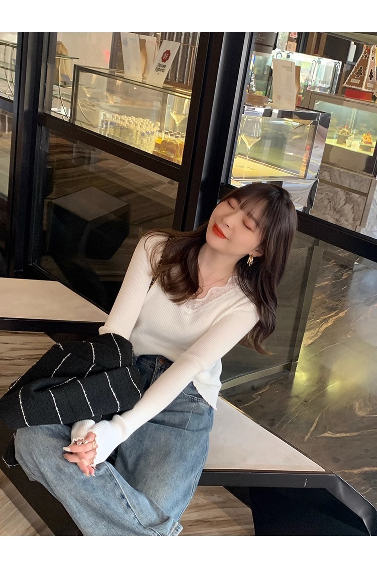 레이스베이스 니트 여성 2024 새로운 스타일 외국 스타일 내부 나무 가장자리 스웨터 낮은 목 디자인 틈새스토어 가기