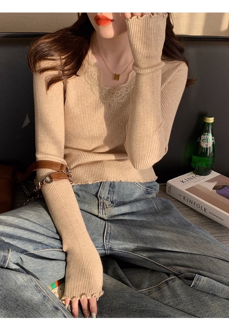 레이스베이스 니트 여성 2024 새로운 스타일 외국 스타일 내부 나무 가장자리 스웨터 낮은 목 디자인 틈새