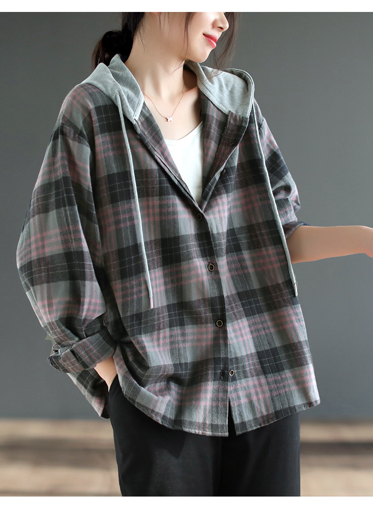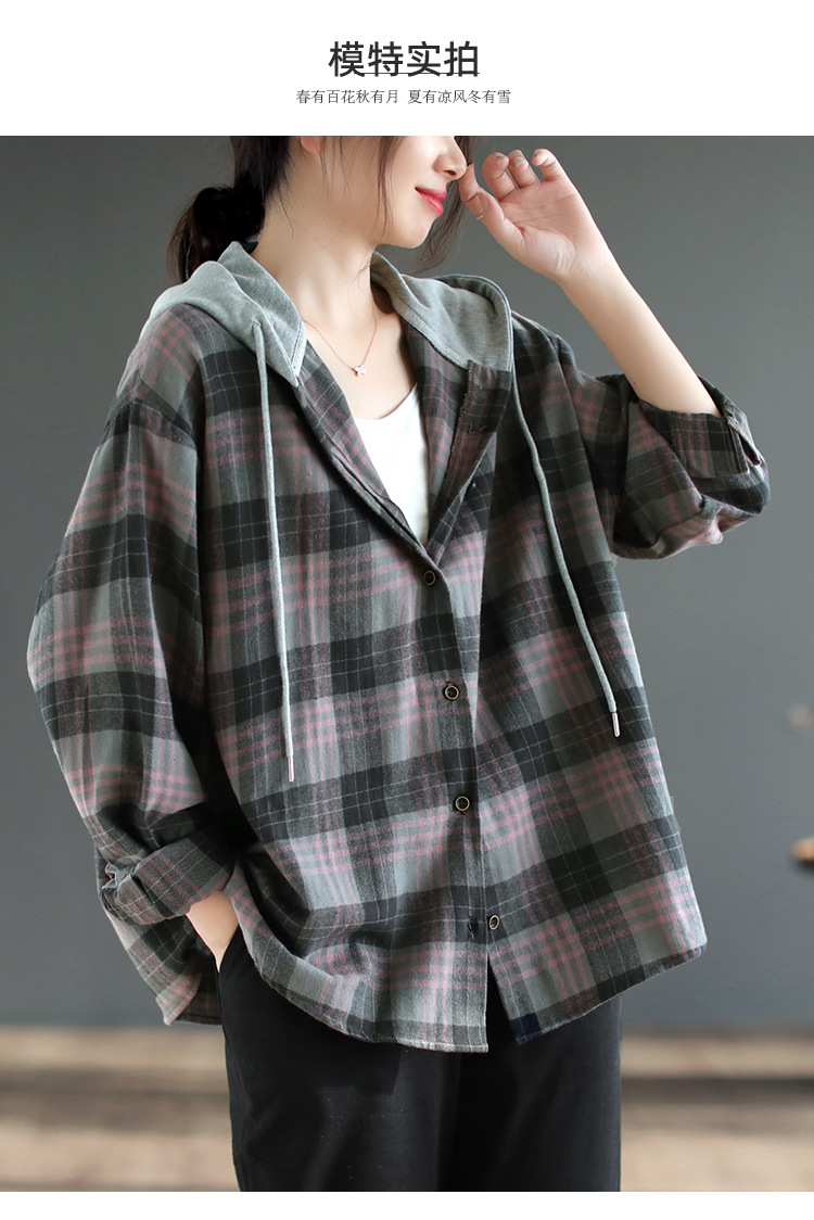 2025 봄 신상 예술적 캐주얼 루즈 후드 싱글 브레스트 체크 무늬 얇은 기모 긴팔 셔츠 여성용스토어 가기