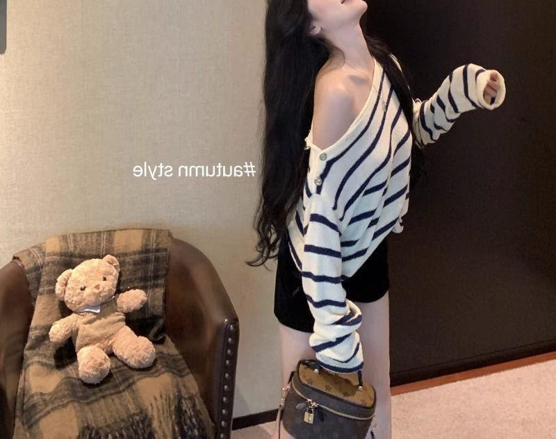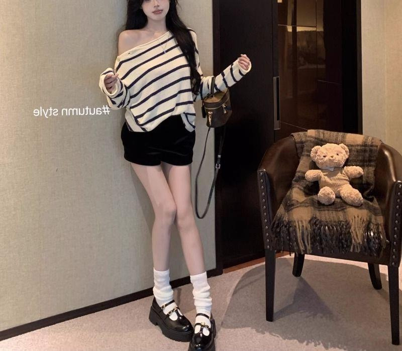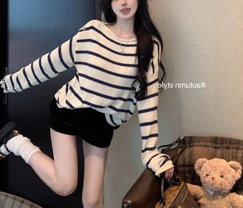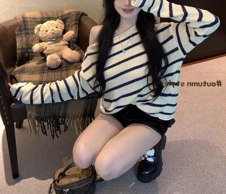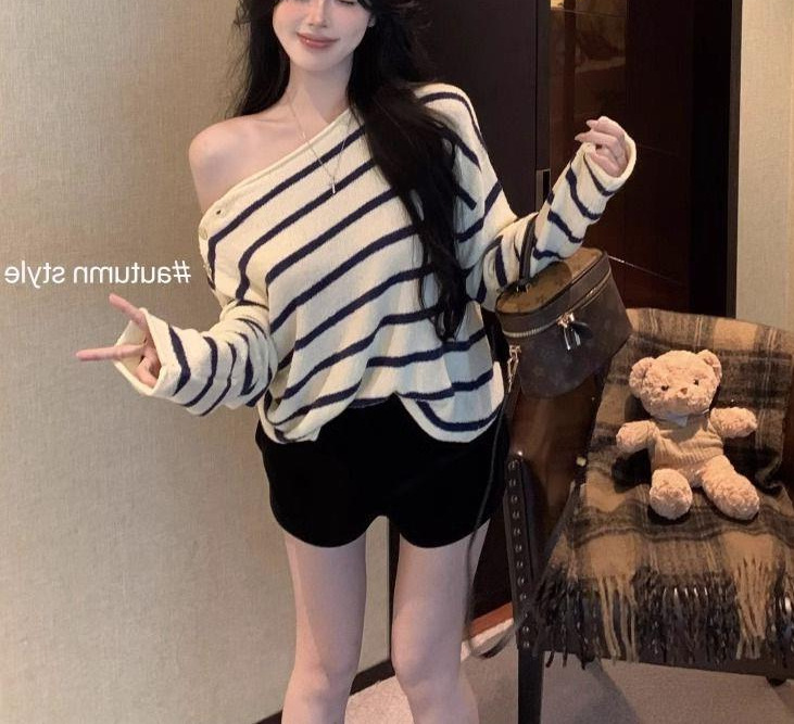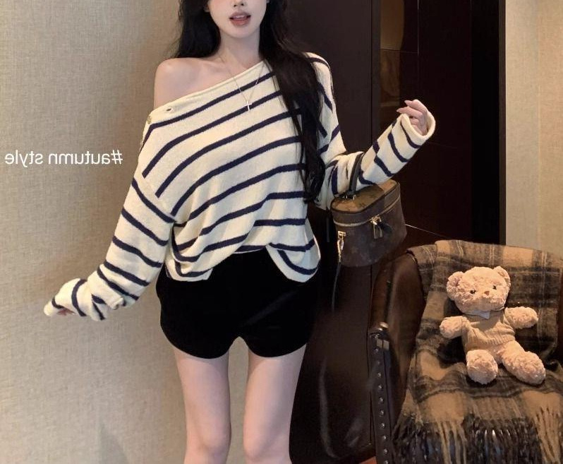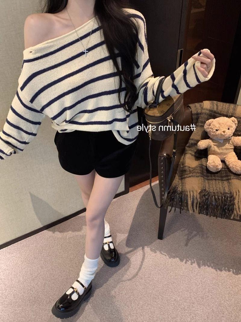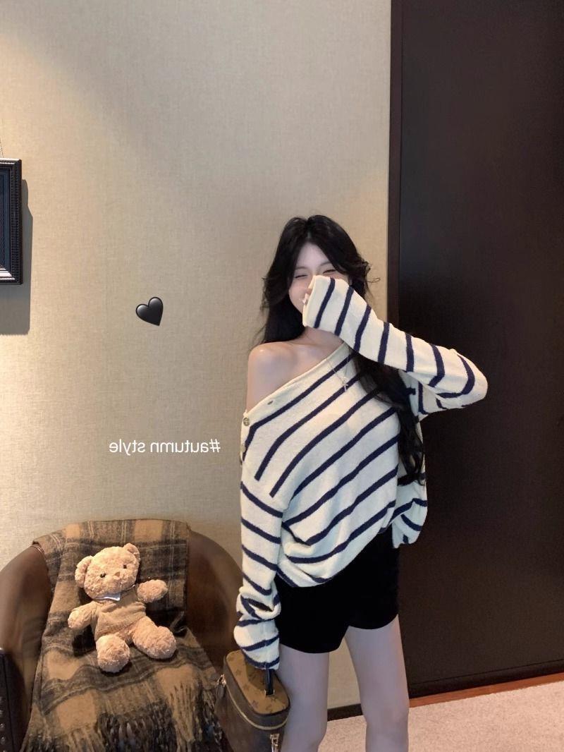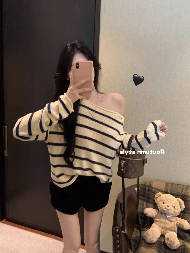 줄무늬 스웨터 여성의 가을과 겨울 새로운 미국 순수한 욕망 슬란 트 숄더 탑 게으른 느슨한 슬림 숄더 스웨터 재킷스토어 가기