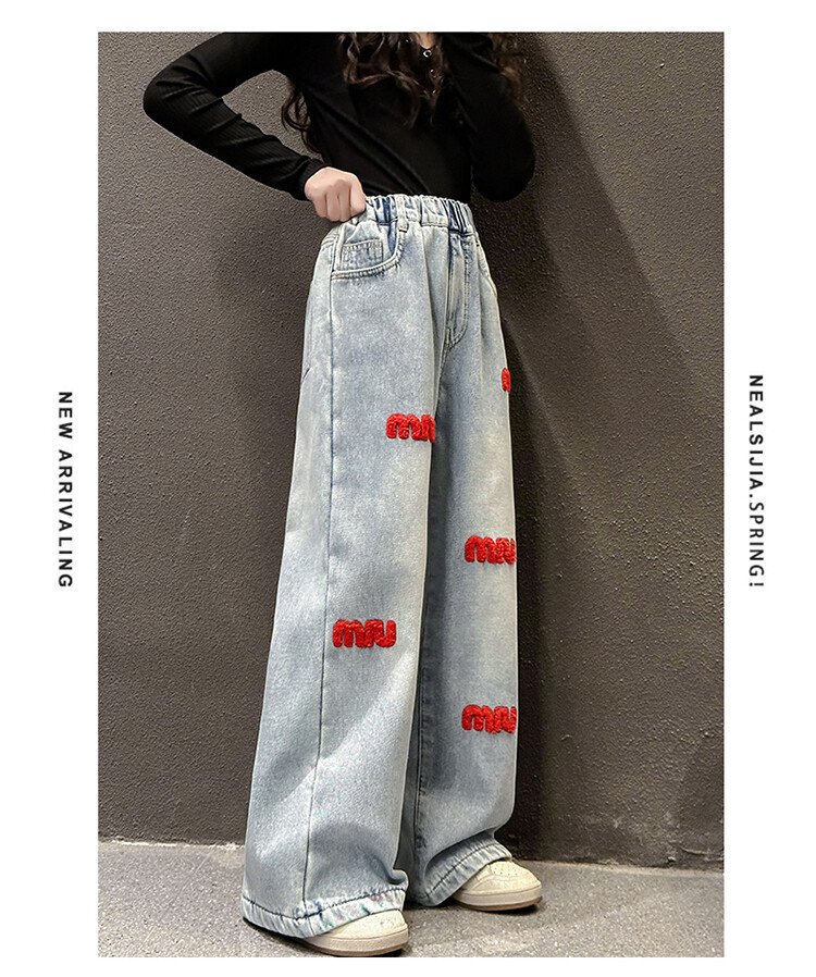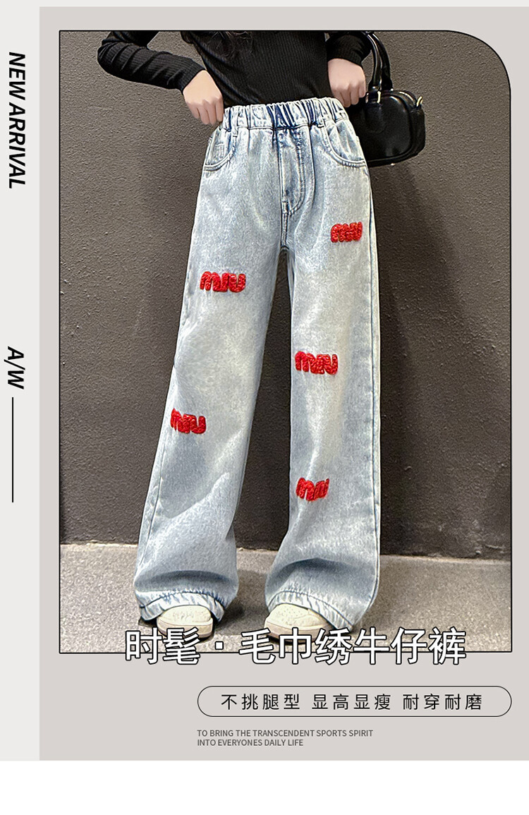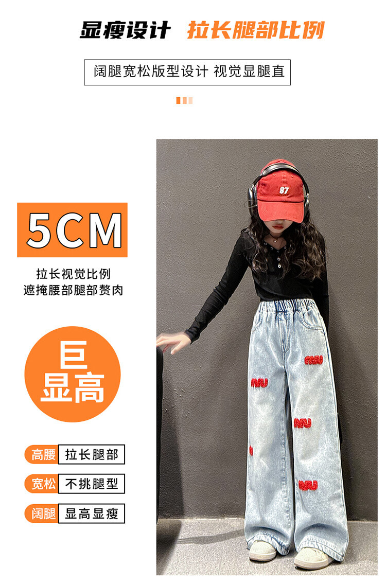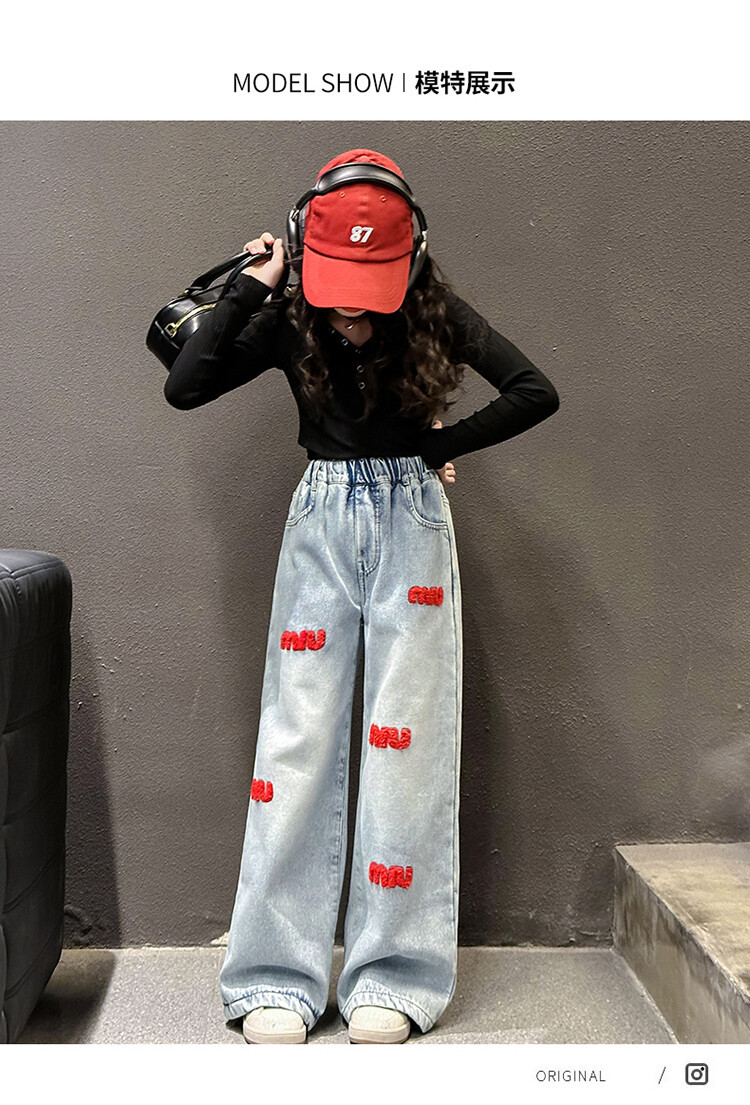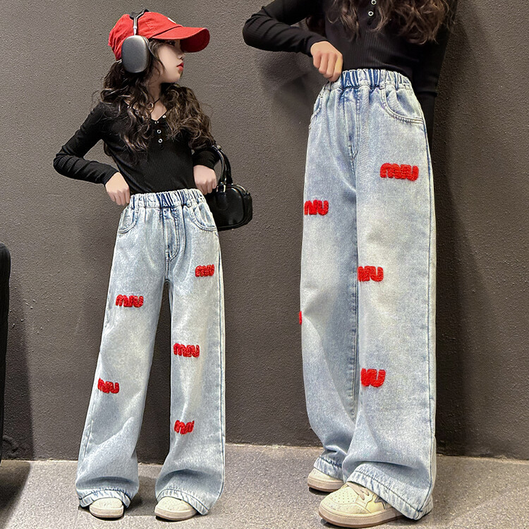 소녀의 봄 청바지 2024 새로운 서양식 소녀 봄과 가을 캐주얼 스트레이트 바지 어린이 봄 넓은 다리 바지스토어 가기