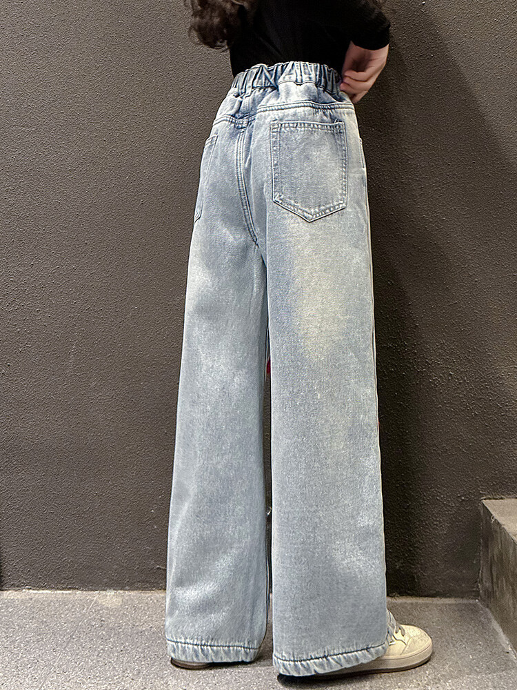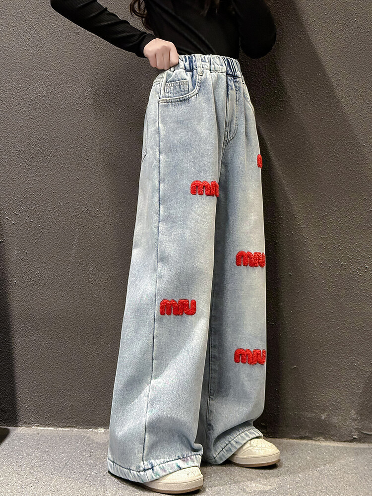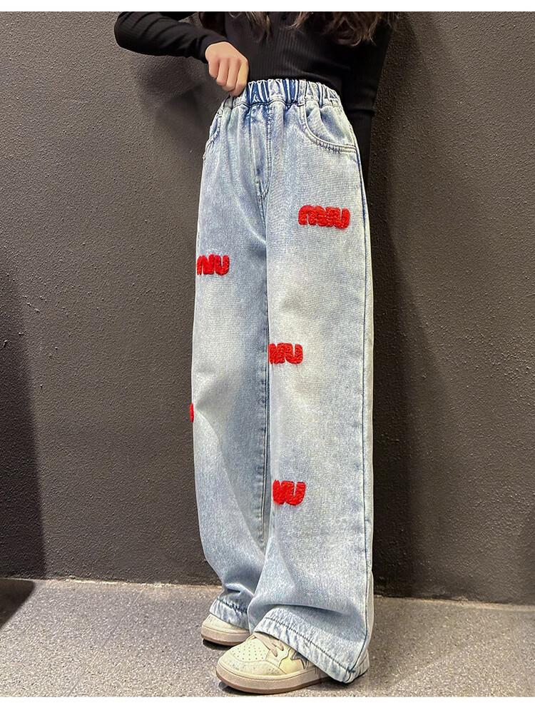 소녀의 봄 청바지 2024 새로운 서양식 소녀 봄과 가을 캐주얼 스트레이트 바지 어린이 봄 넓은 다리 바지