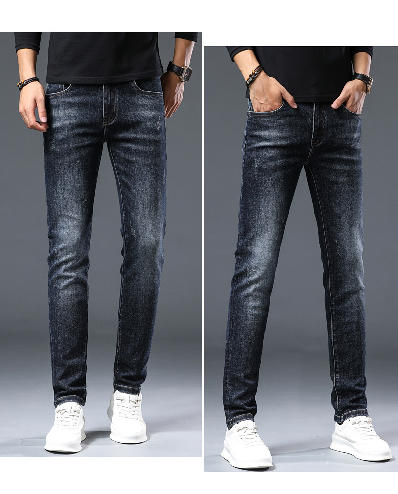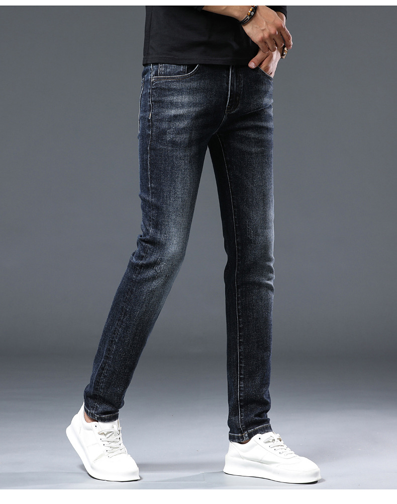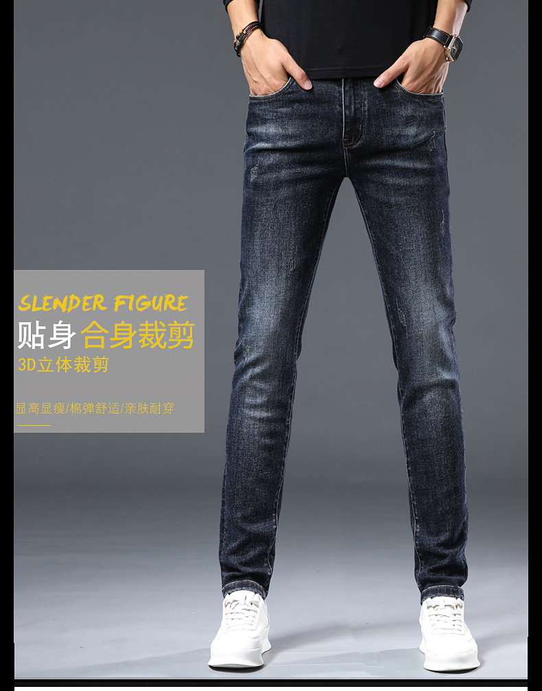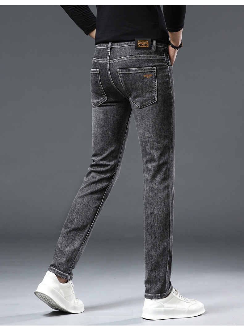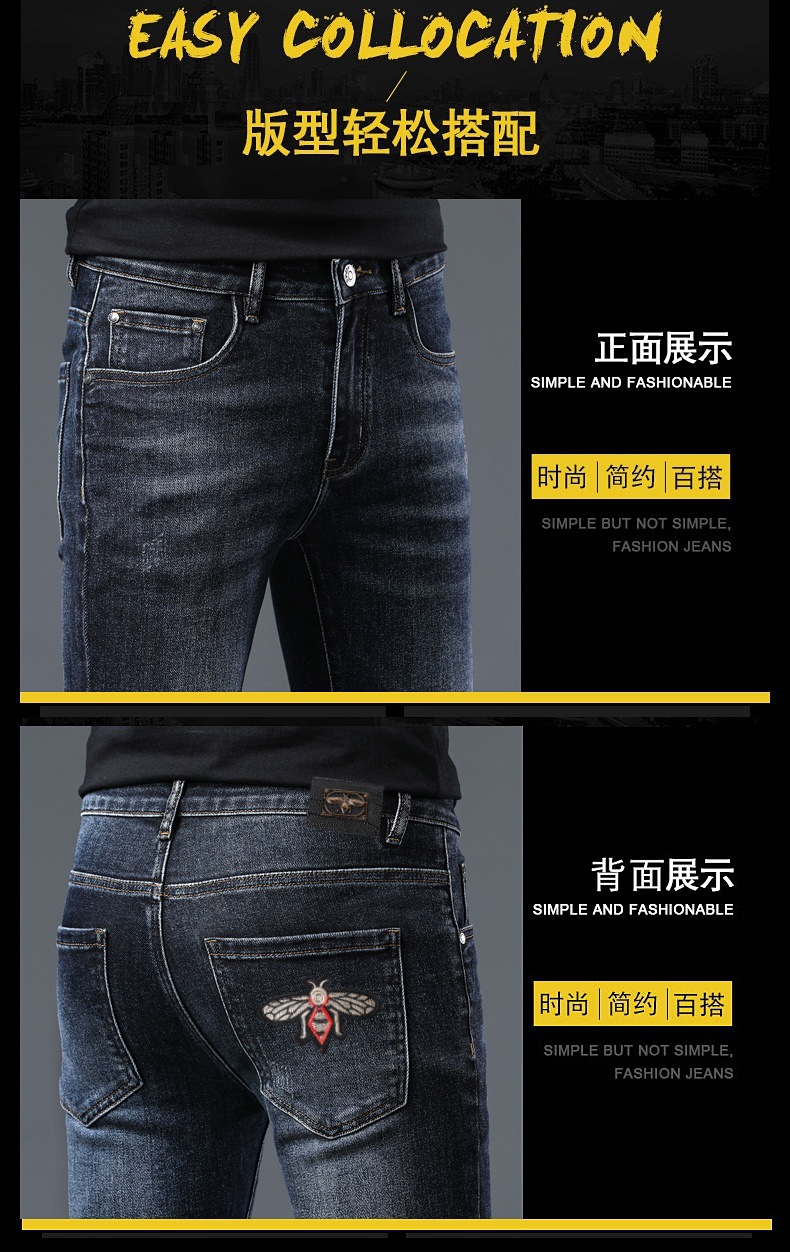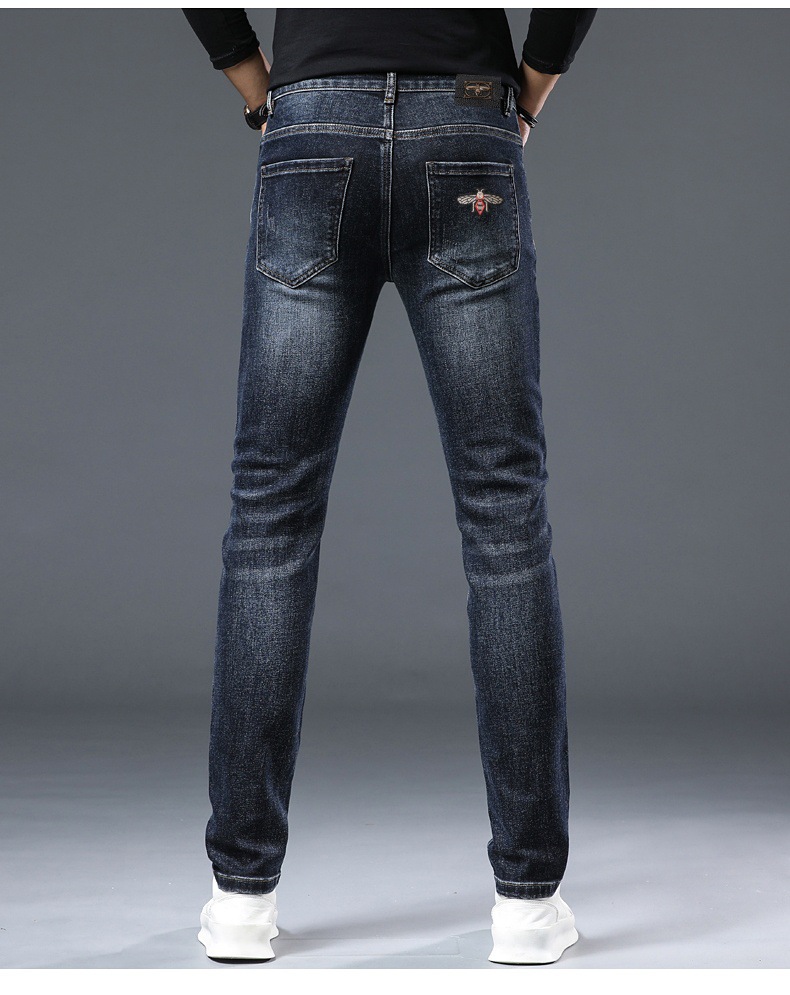 2024 새로운 고급 남성용 청바지 가을과 겨울 스트레치 슬림 핏 다크 블루 캐주얼 꿀벌 바지