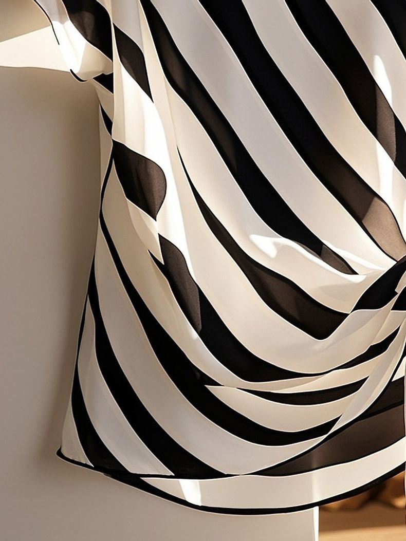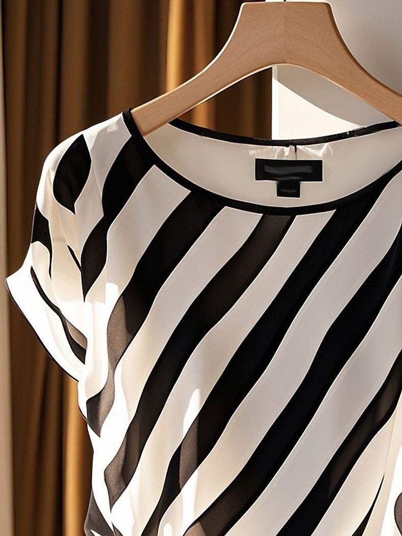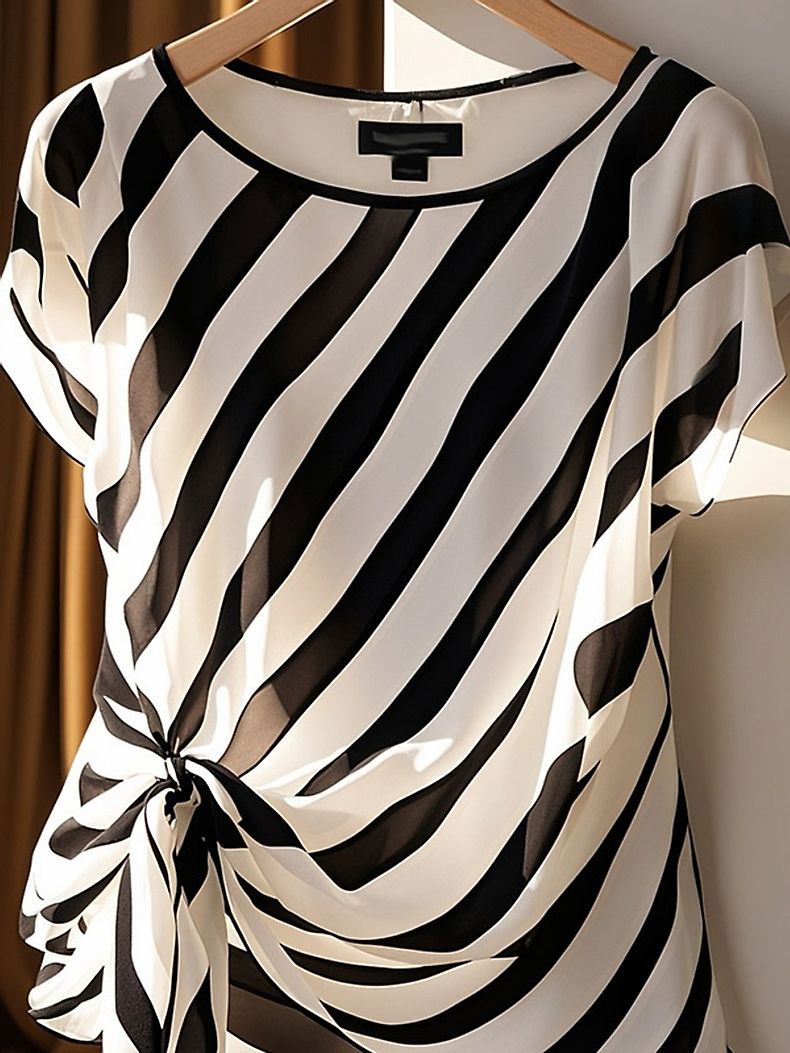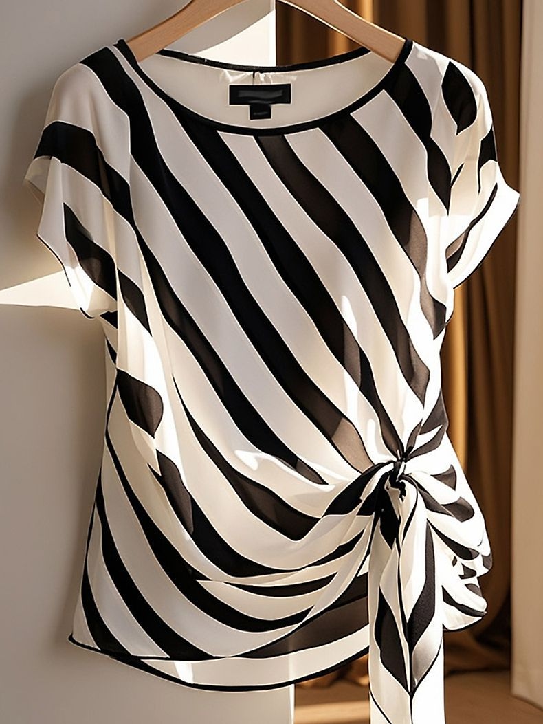 흑백 줄무늬 쉬폰 탑 여성의 짧은 소매 여름 새로운 서양식 작은 셔츠 디자인 감각 불규칙한 프랑스 셔츠