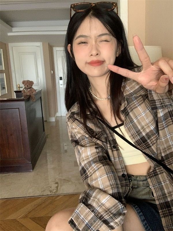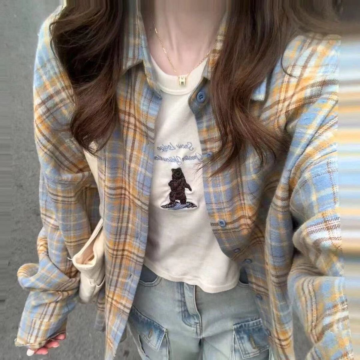 홍콩 스타일 레트로 게으른 격자 무늬 셔츠 여성의 봄과 가을 새로운 슬림핏 루즈 디자인 올 매치 셔츠 아우터 탑