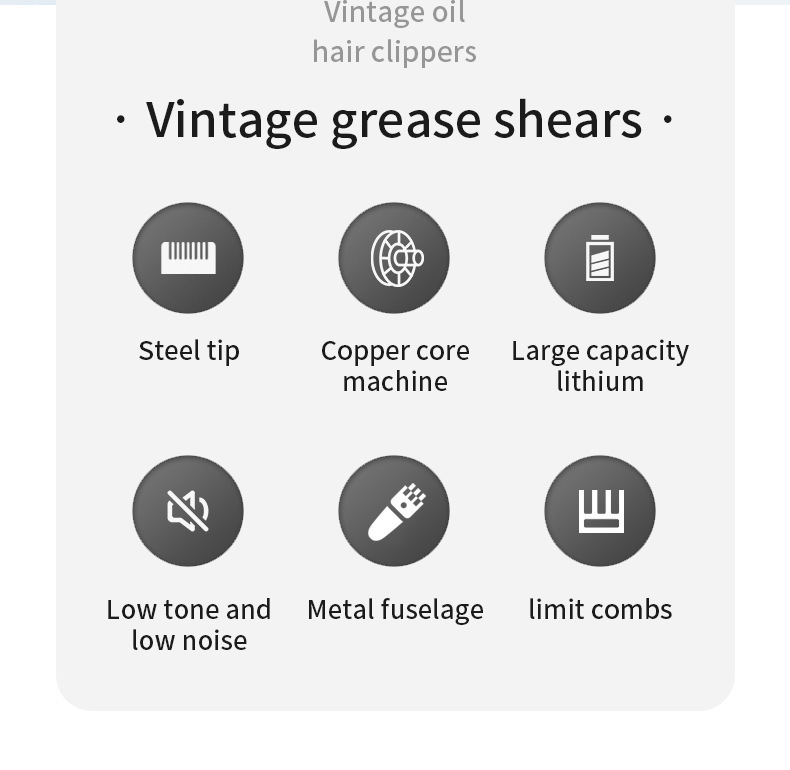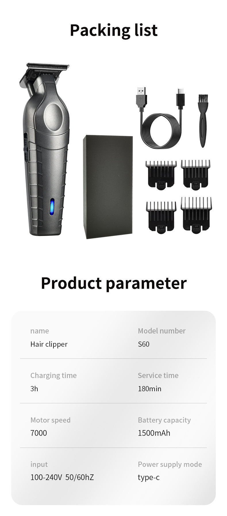 配件:理发器*1、限位梳*4(1.5/3/6/9mm)、清洁刷*1、充电器*1 润滑油*1 Type-c充电线