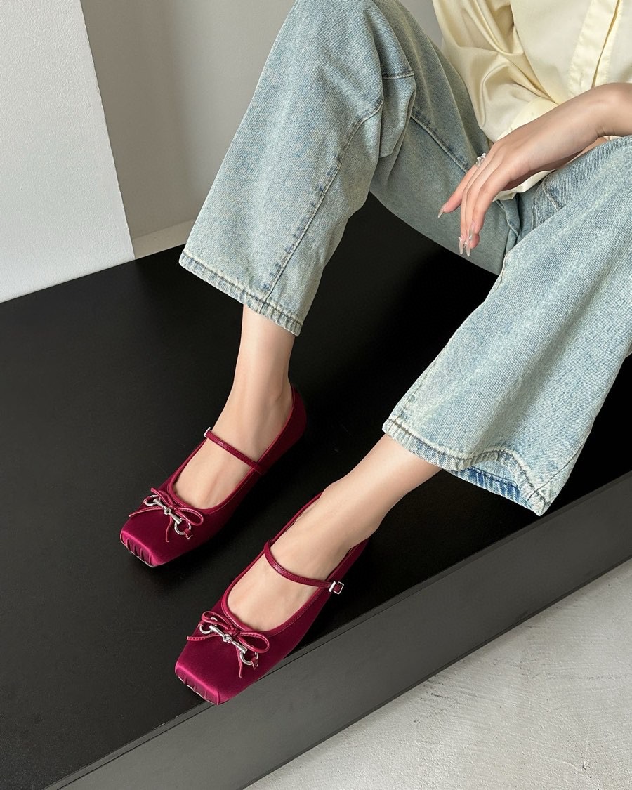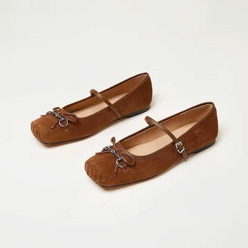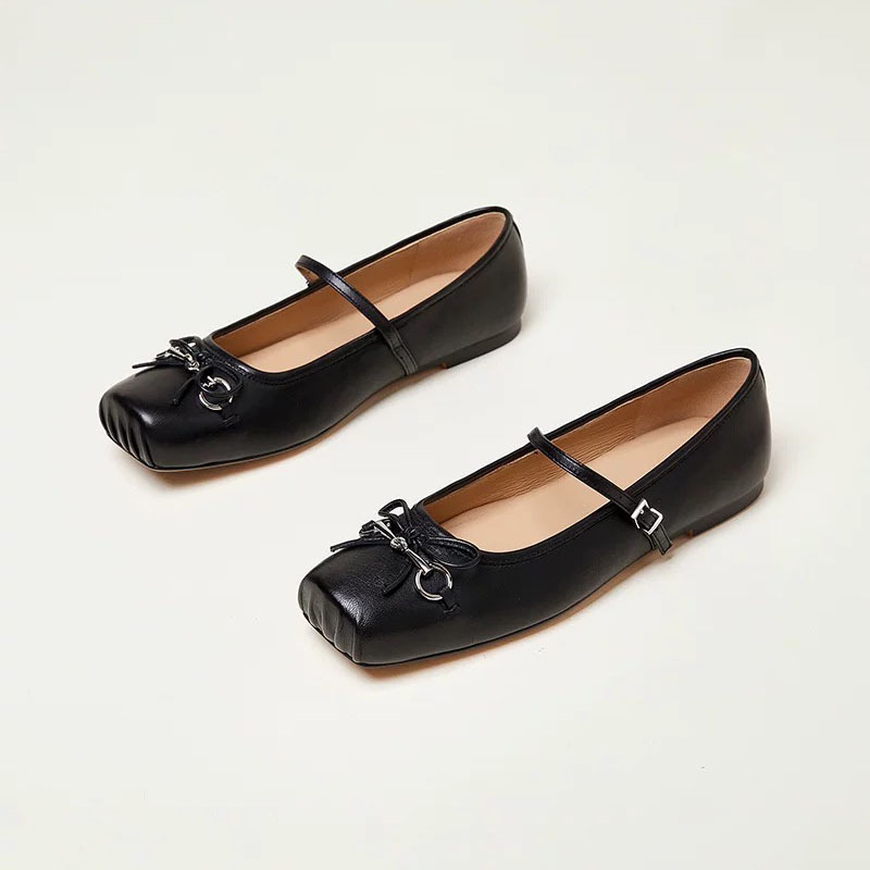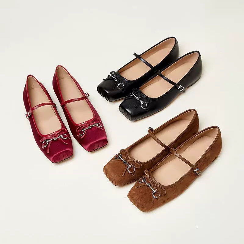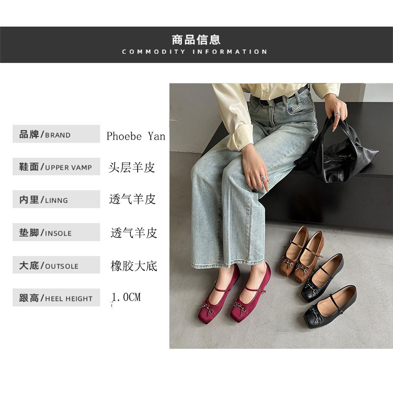 가을 새로운 프랑스 스타일 로우 힐 스퀘어 토 싱글 신발 플랫 바닥 얕은 입 여성용 우아한 정품 가죽 돼지 코 발레 신발