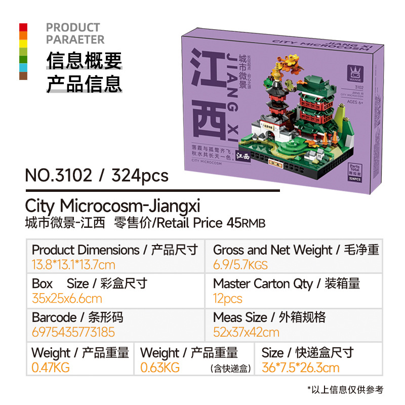 Wange 작은 입자 교육 장난감 조립 어린이 선물 6-12 세 중국 빌딩 블록 국가 트렌드 도시 마이크로 풍경 Jiangxi스토어 가기