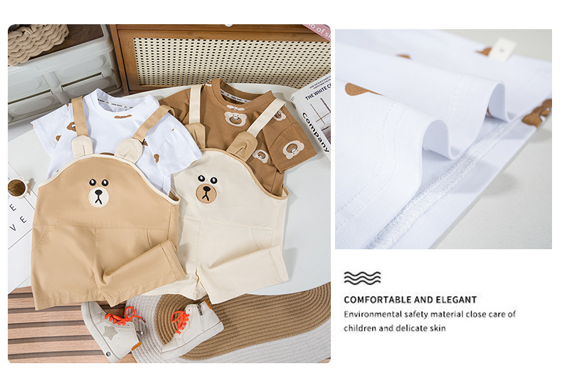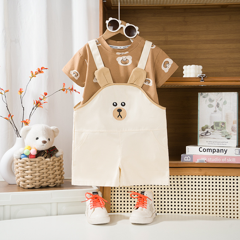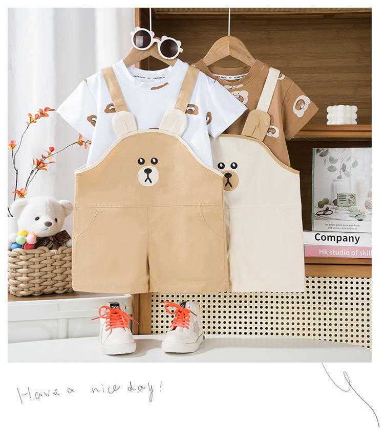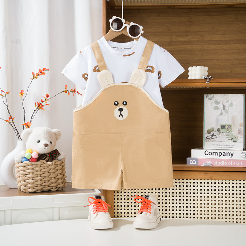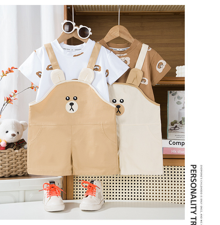 아기 2024 새로운 여름 세트 잘 생긴 소년 반팔 티셔츠 소녀 스트랩 바지 어린이 여름 투피스 세트스토어 가기