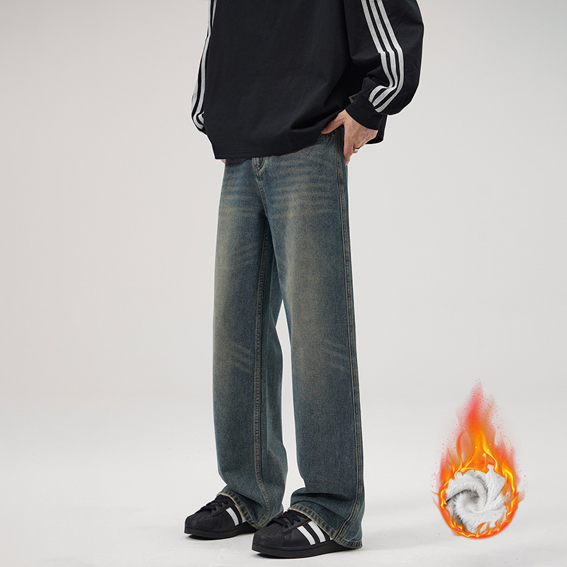 LKTM 남성복 가을 겨울 아메리칸 레트로 워싱 스트레이트 데님 팬츠 남성용 플러스 벨벳 두꺼운 루즈핏 따뜻한 긴바지