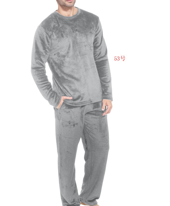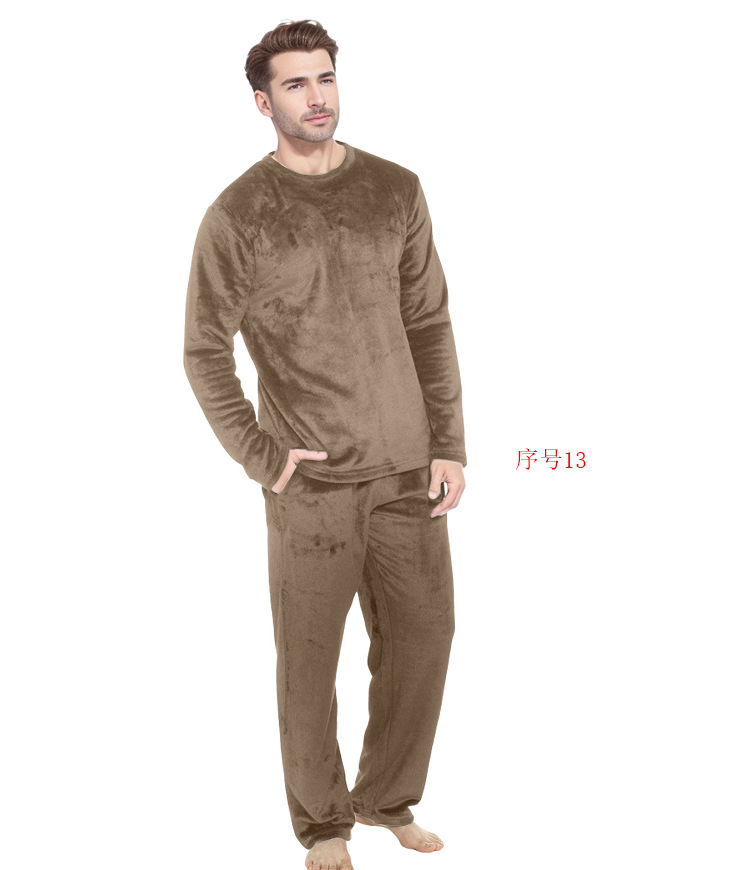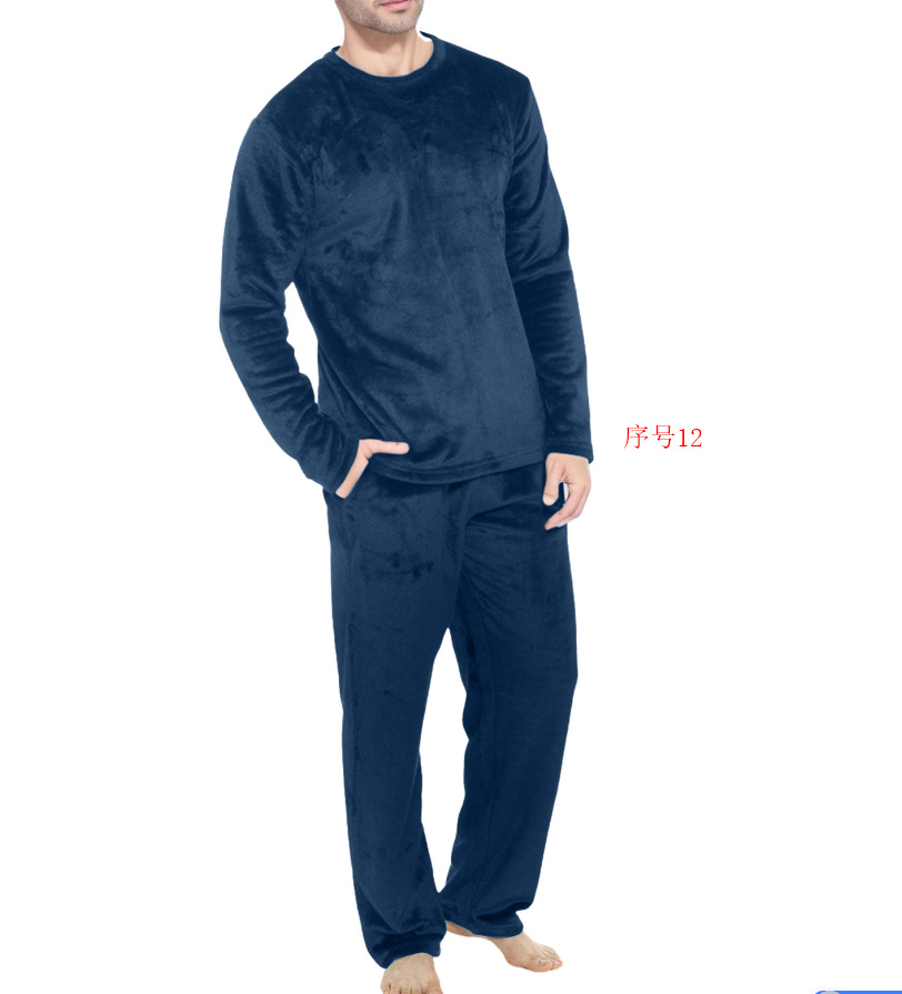 2024 년 새로운 유럽과 미국의 아마존 플란넬 남자 크루 넥 긴 소매 바지 플란넬 파자마 세트 가을과 겨울