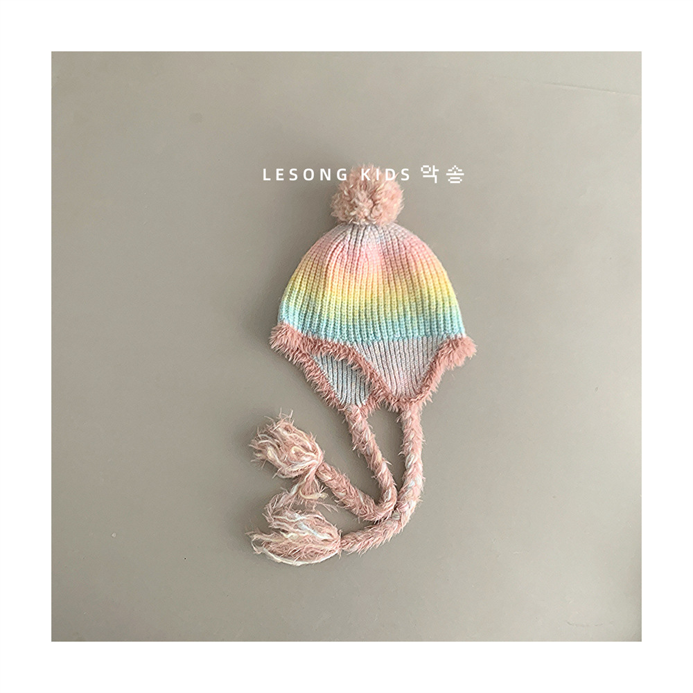 韩系时尚渐变色儿童毛球护耳帽