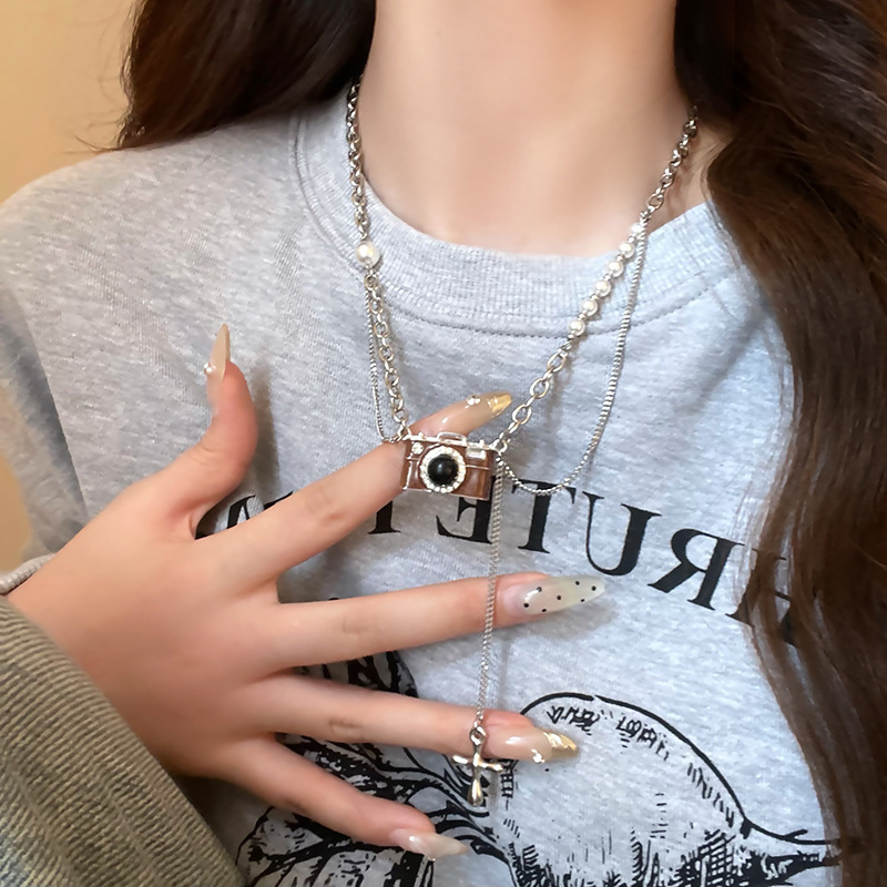 빈티지 다크 브라운 카메라 펜던트 목걸이 여성 2024 새로운 틈새 디자인 맞춤형 힙합 스택 웨어러블 체인스토어 가기