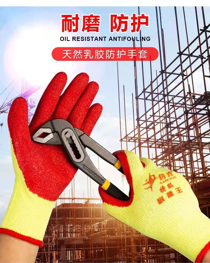 내마모성 킹 장갑 노동 보호 내마모성 코튼 라인 담그기 접착제 주름 고무 두꺼운 유리 공장 작업 보강 노동자 Lu Guang스토어 가기