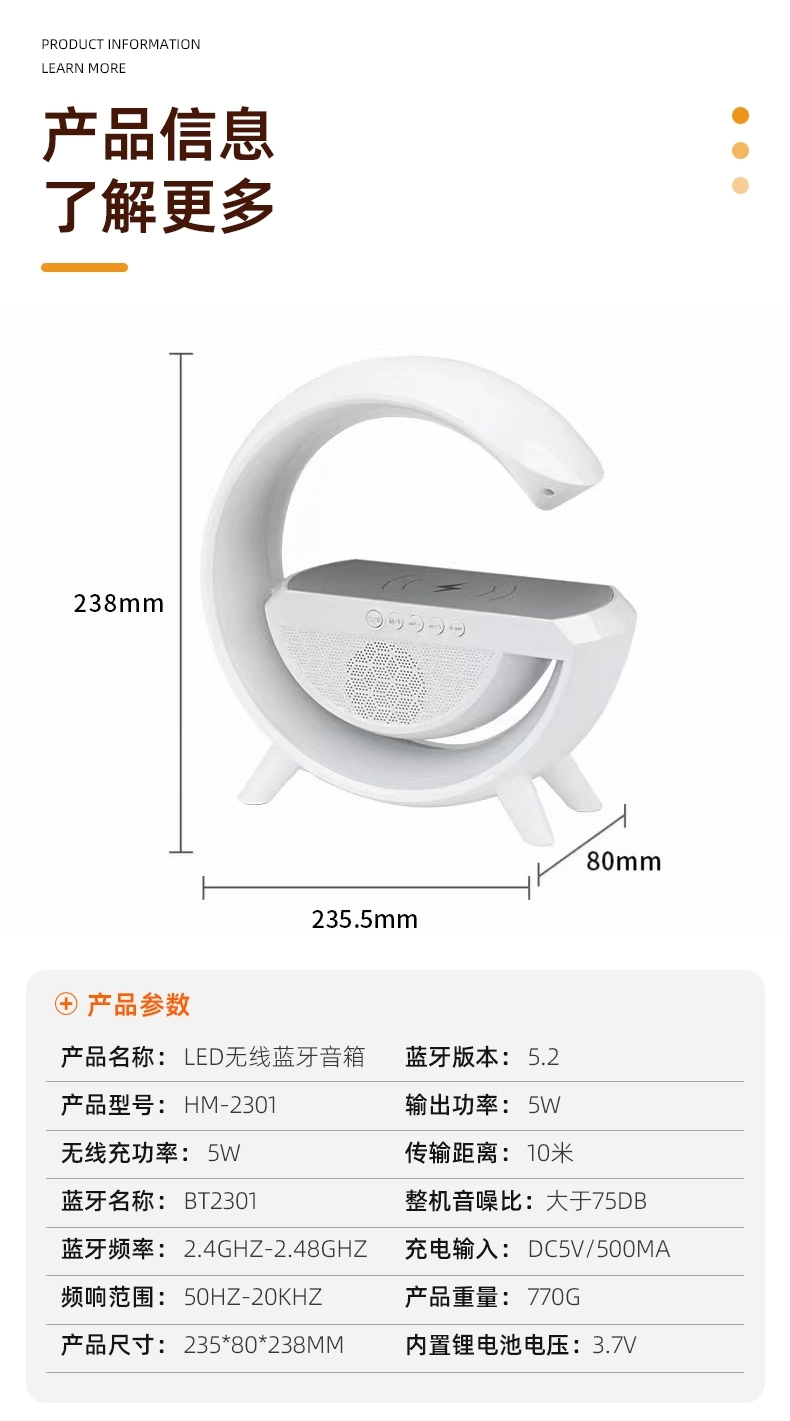 • 표준 모델: 디지털 디스플레이 없음 + 스피커 + 알람 시계 + 무선 충전 + 9색 야간 조명 + 대형