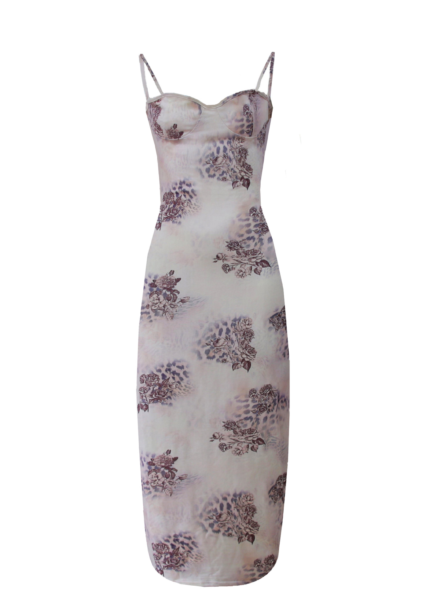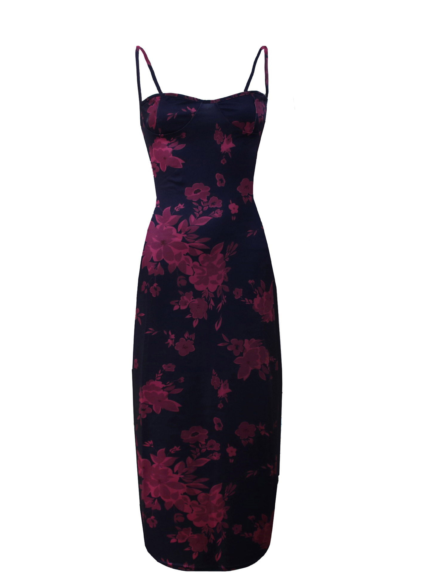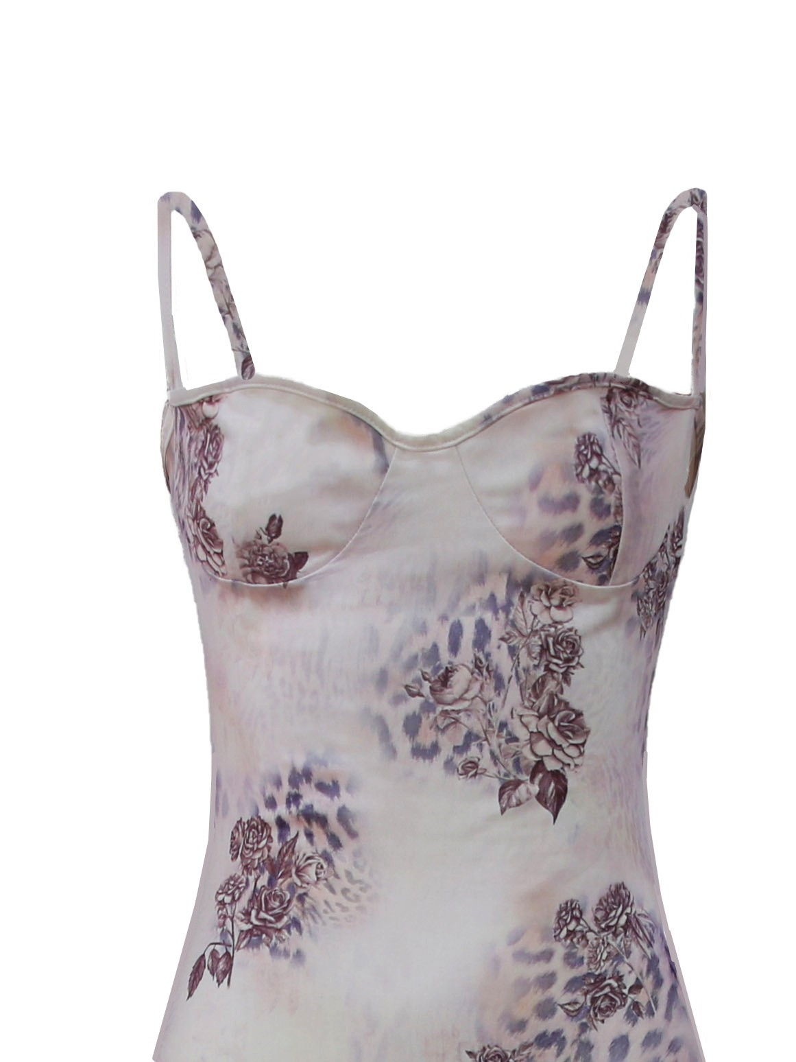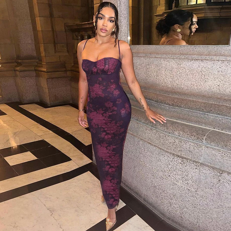 재고 국경 간 유럽과 미국식 여성의 우아한 슬림 핏 허리 원피스 스트랩 가슴 공개 꽃 인쇄 긴 원피스스토어 가기
