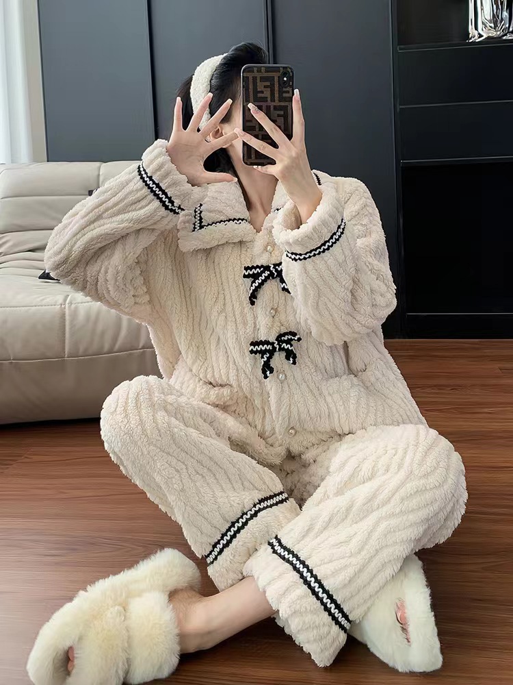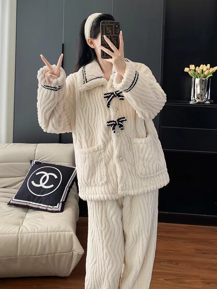 잠옷 여성의 가을과 겨울 새로운 플란넬 홈 옷 산호 양털 두꺼운 기모 달콤한 공주 스타일 따뜻한 옷 세트
