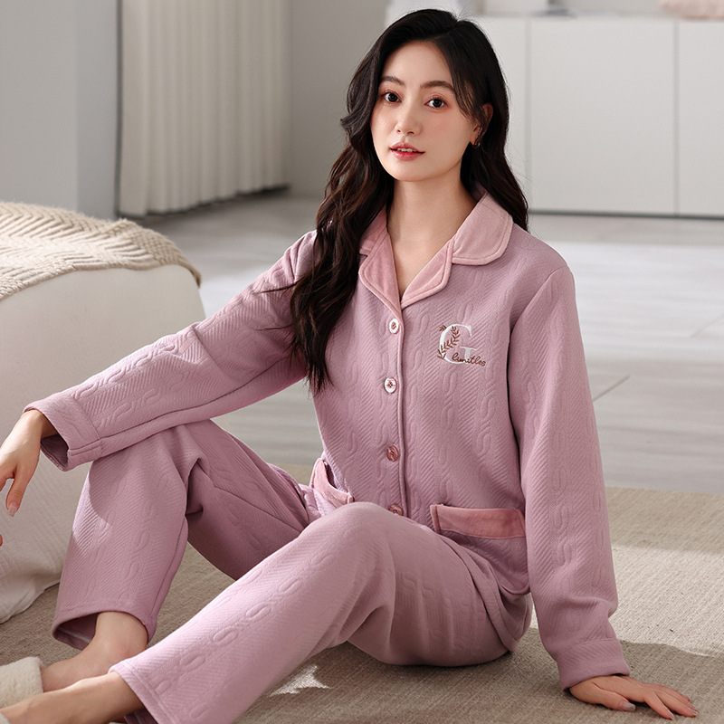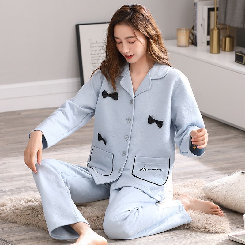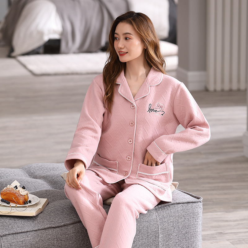 에어 코튼 파자마 여성의 가을과 겨울 젊고 중년의 순면 샌드위치 세트 가을과 겨울 얇은 면화 착용 홈 의류스토어 가기