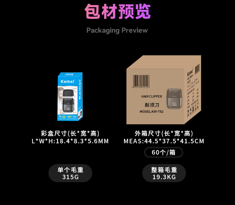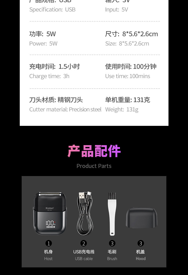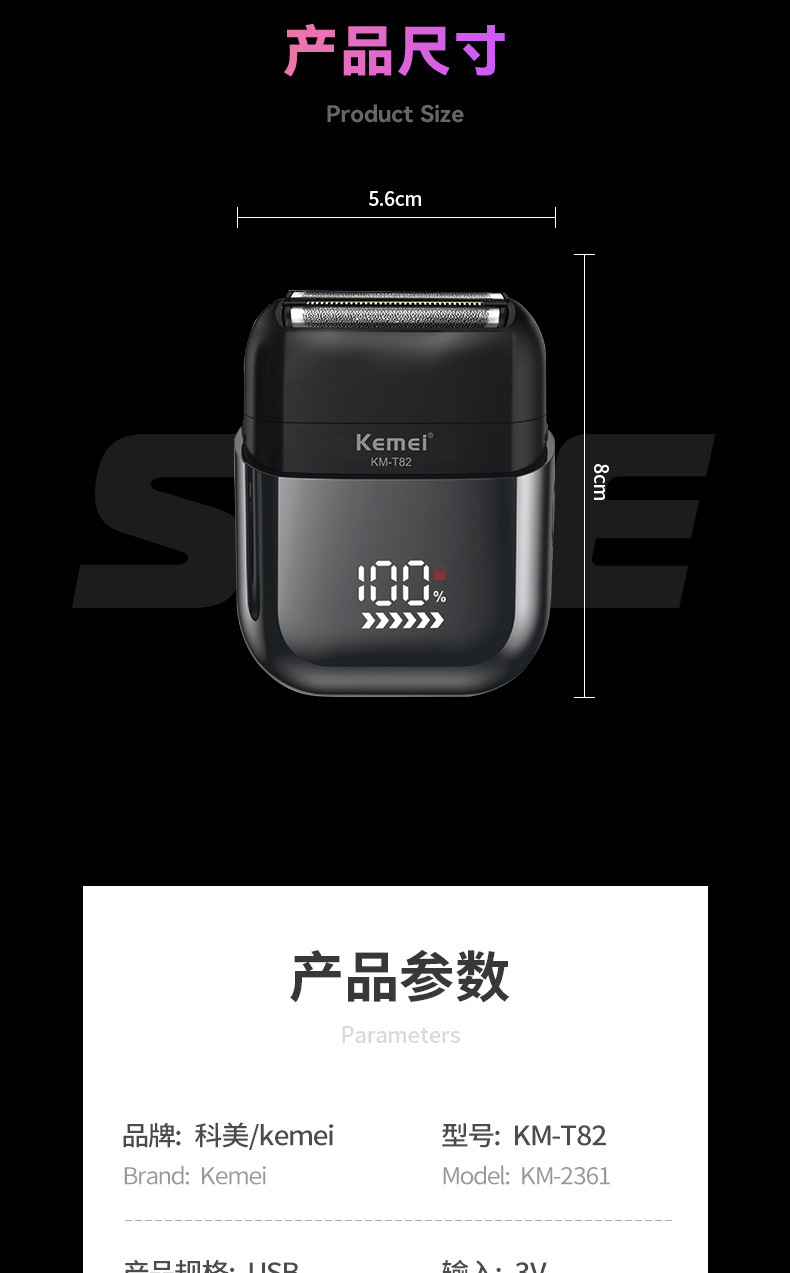 Kemei KM-T82 새로운 면도기 미니 고출력 휴대용 세척 가능 남성용 전기 면도기 1개 배치