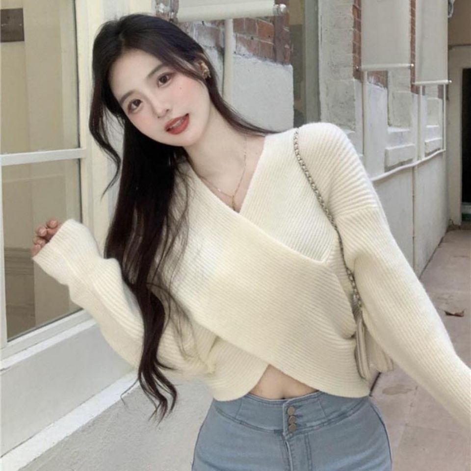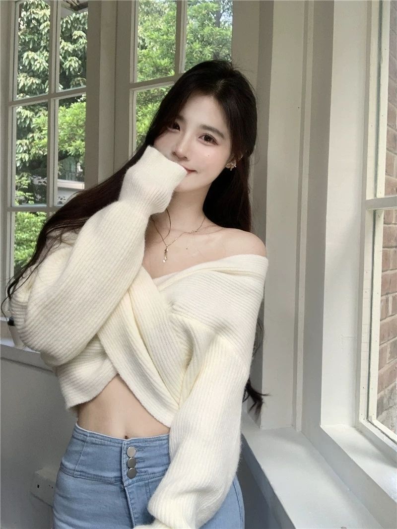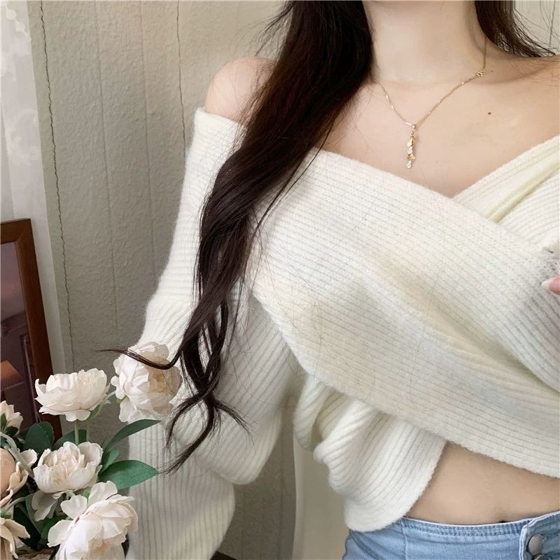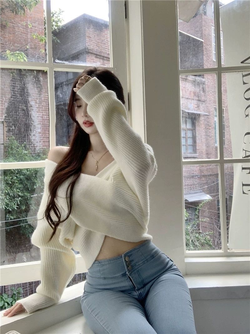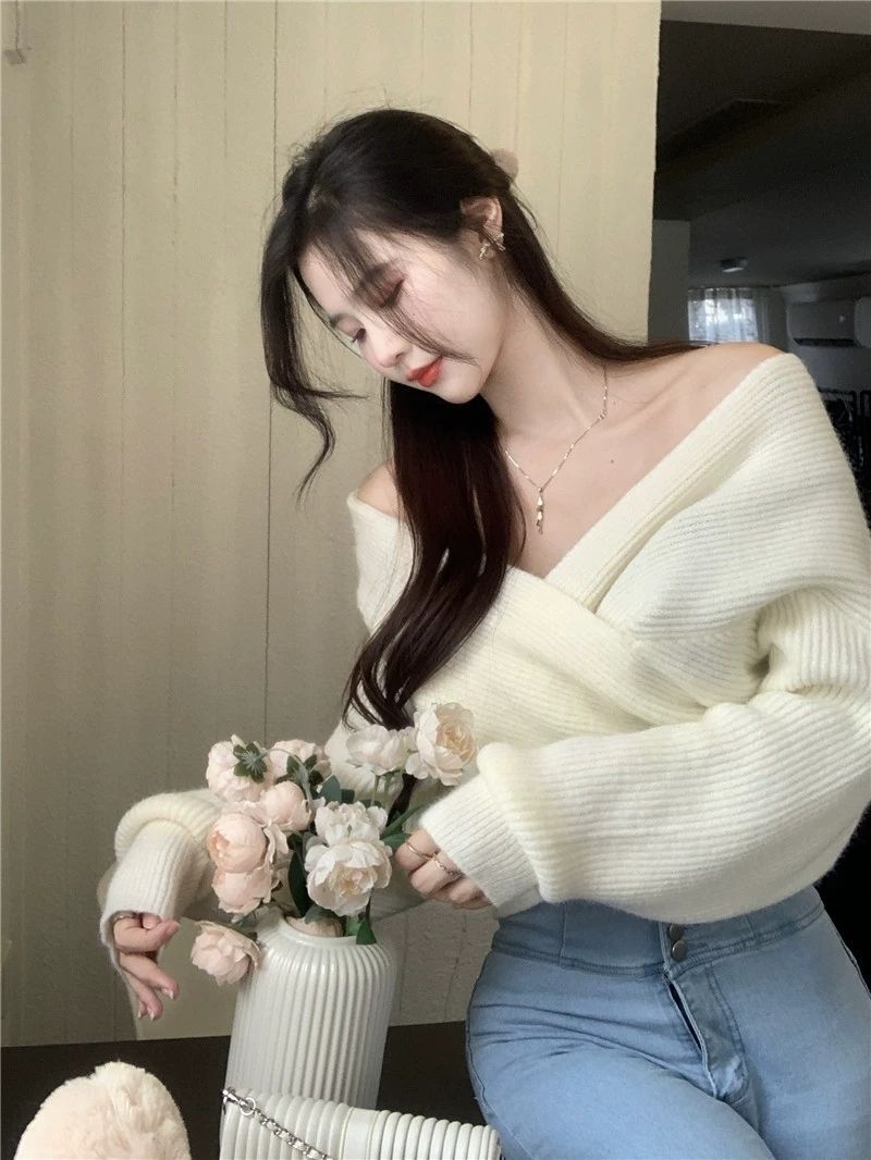 V 넥 크로스 니트 스웨터 여성의 느긋한 스타일 느슨한 오프 숄더 디자인 틈새 쇄골 코드와 같은 탑스토어 가기