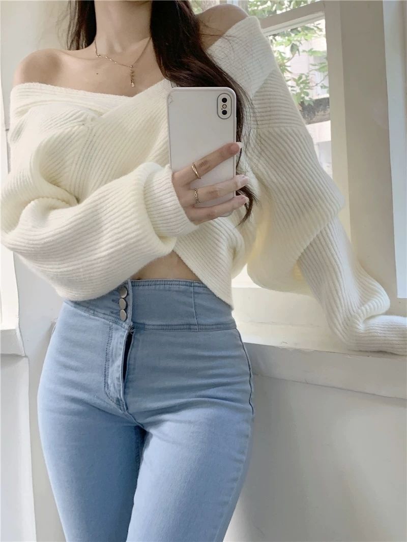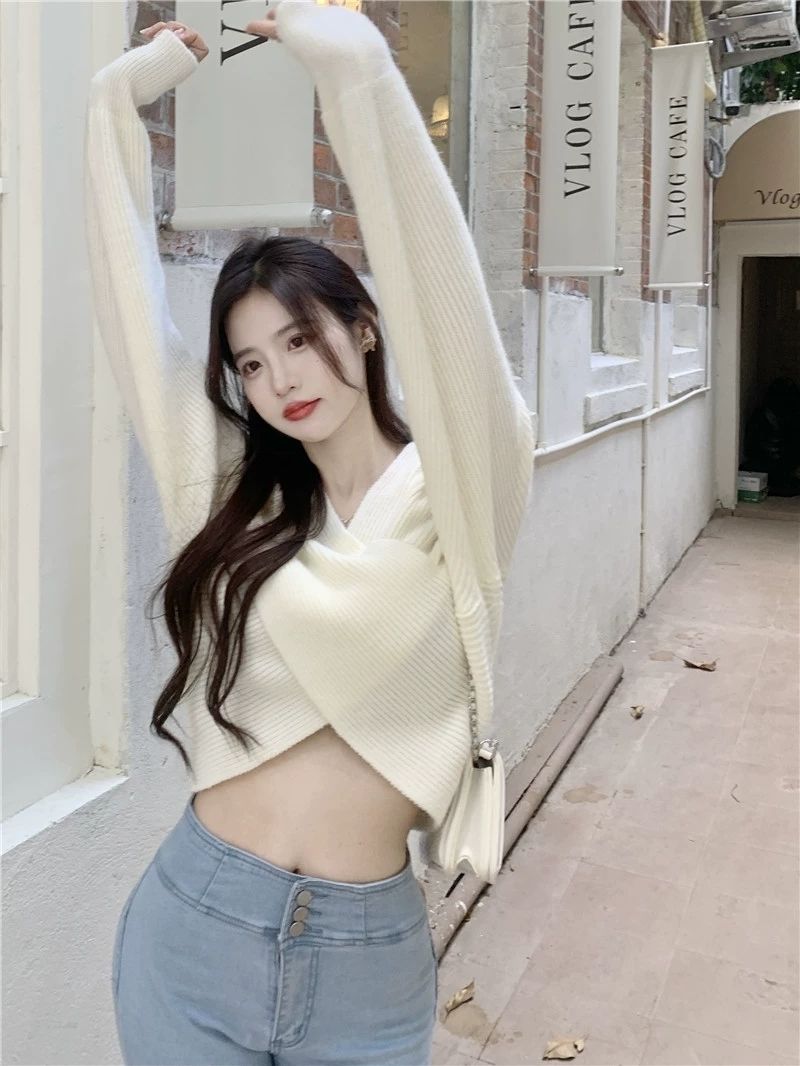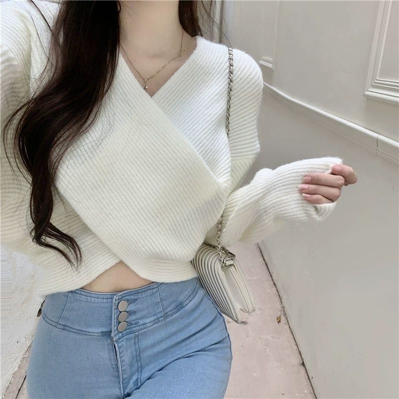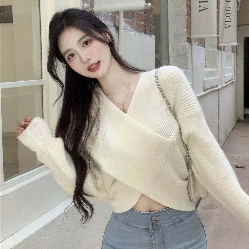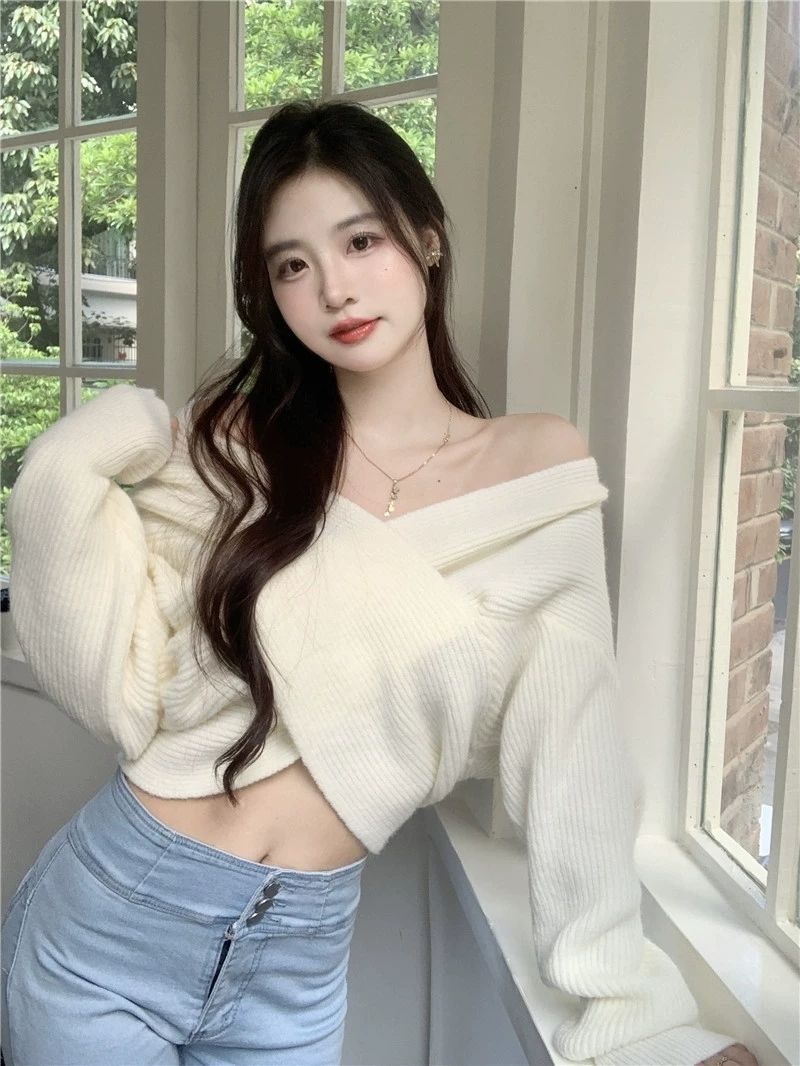 V 넥 크로스 니트 스웨터 여성의 느긋한 스타일 느슨한 오프 숄더 디자인 틈새 쇄골 코드와 같은 탑스토어 가기