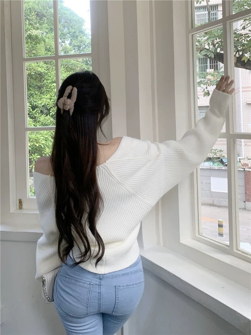 V 넥 크로스 니트 스웨터 여성의 느긋한 스타일 느슨한 오프 숄더 디자인 틈새 쇄골 코드와 같은 탑