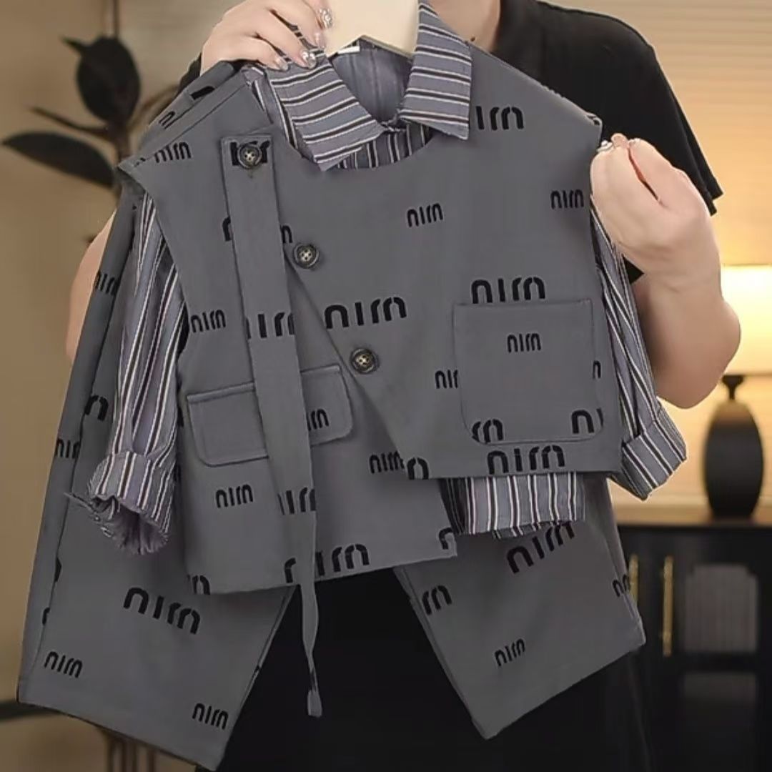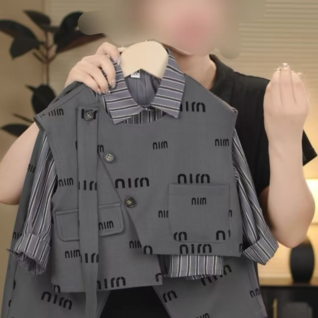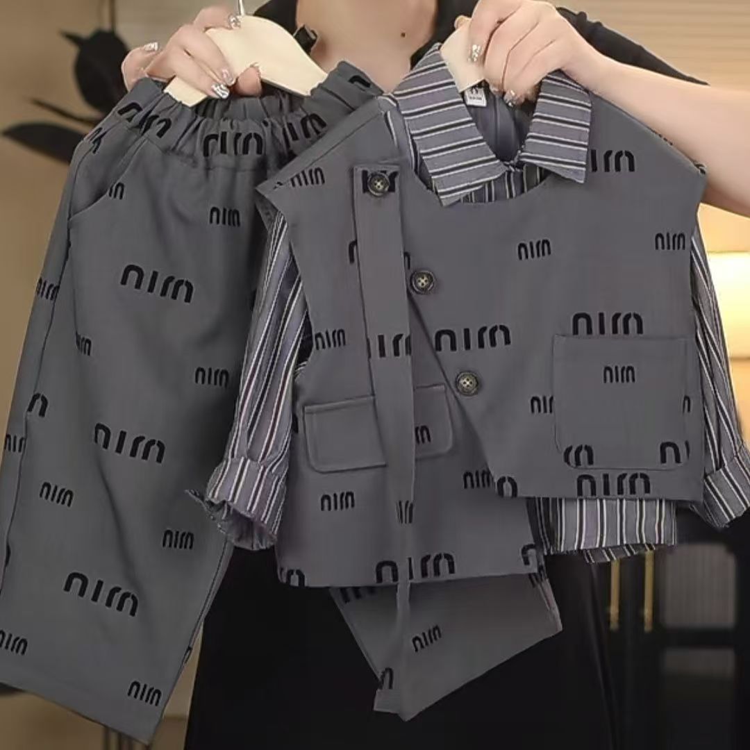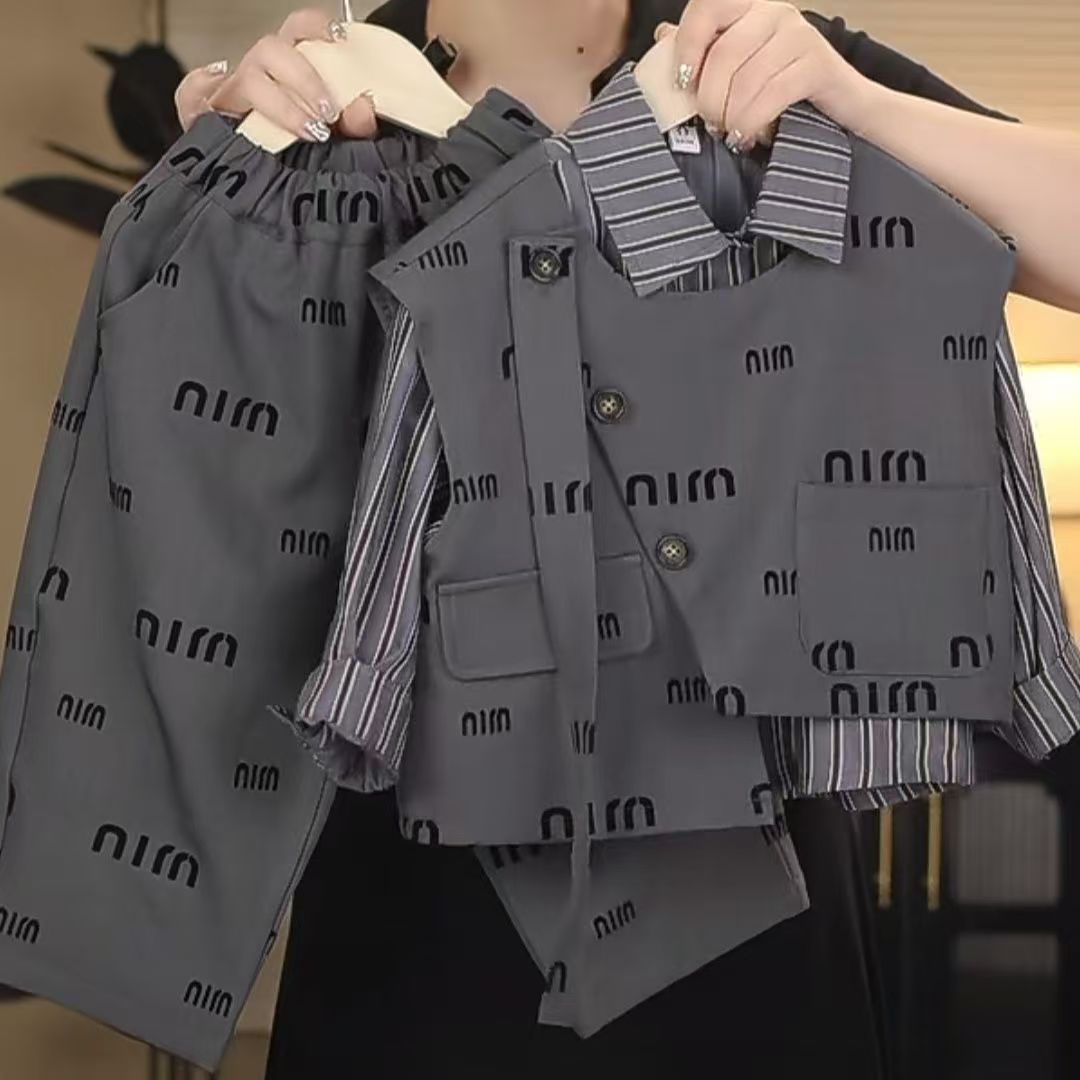 어린이 세트 2024 새로운 소년 대학 스타일 어린이 아기의 캐주얼 패션 셔츠 조끼 및 바지 3 피스 세트