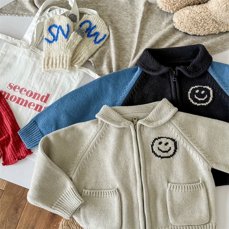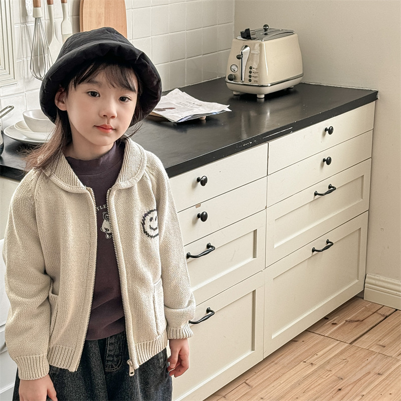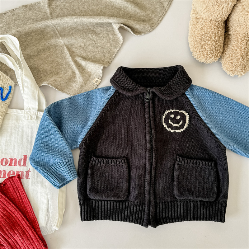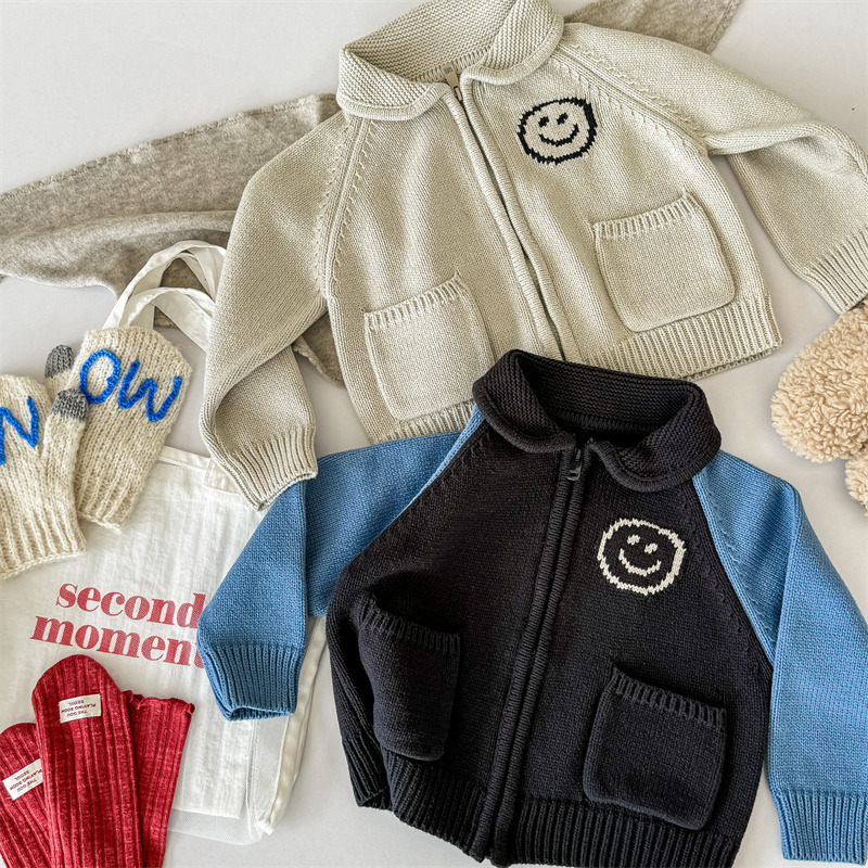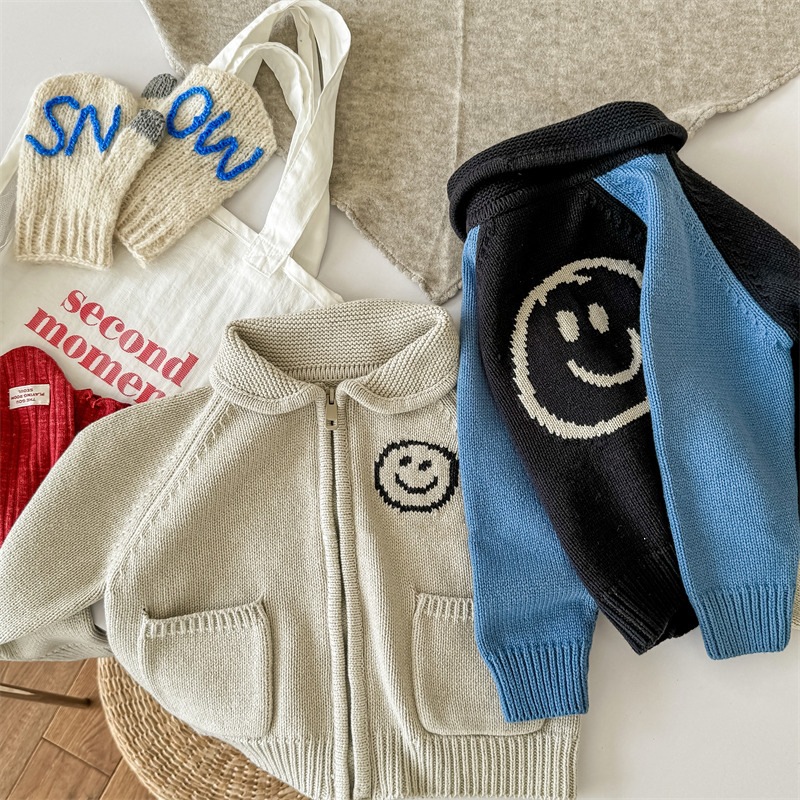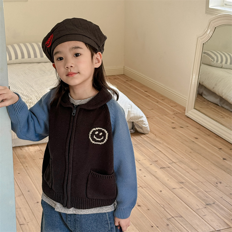 가을 2024 어린이 스웨터 카디건 소녀 한국 스마일리 페이스 컬러 블록 옷깃 지퍼 니트 카디건 스웨터 코트스토어 가기