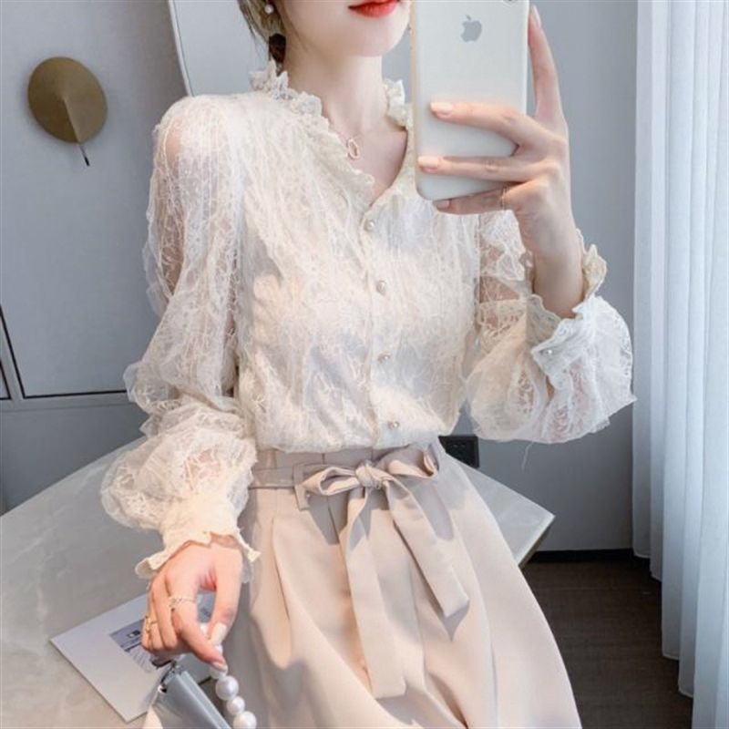 이른 봄 프랑스 틈새 최고의 여성 내부 디자인 달콤하고 부드러운 스타일 레이스 셔츠 요정 긴 소매 쉬폰 셔츠스토어 가기