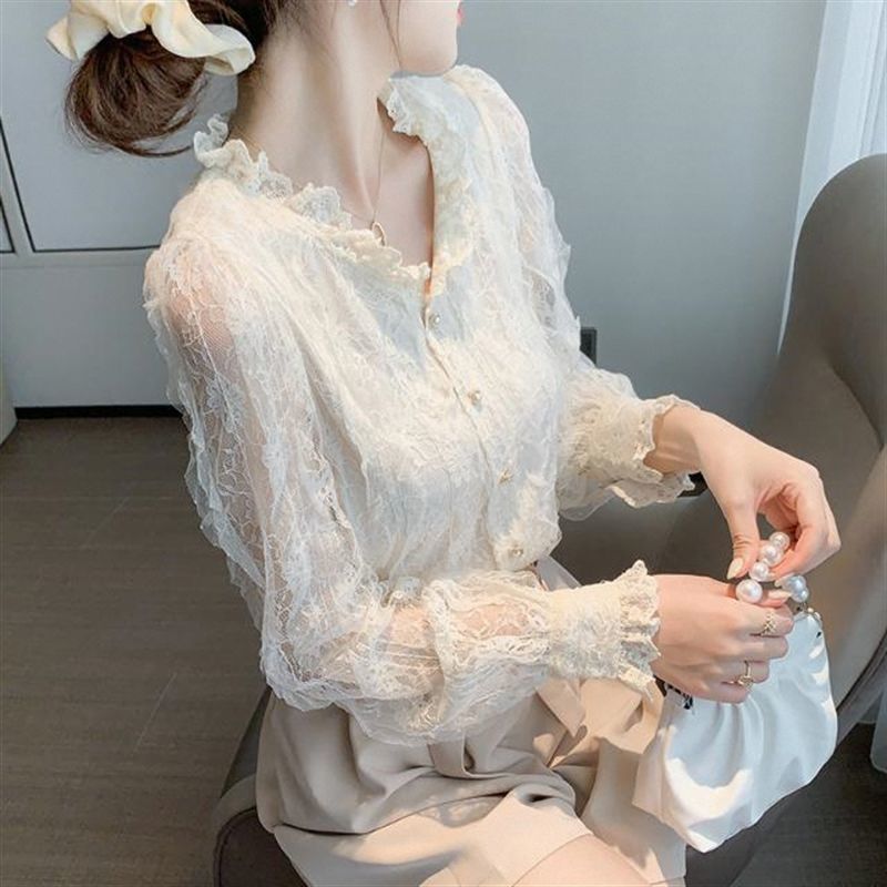 이른 봄 프랑스 틈새 최고의 여성 내부 디자인 달콤하고 부드러운 스타일 레이스 셔츠 요정 긴 소매 쉬폰 셔츠