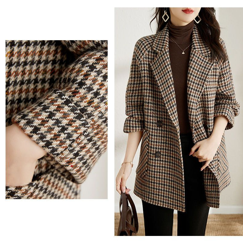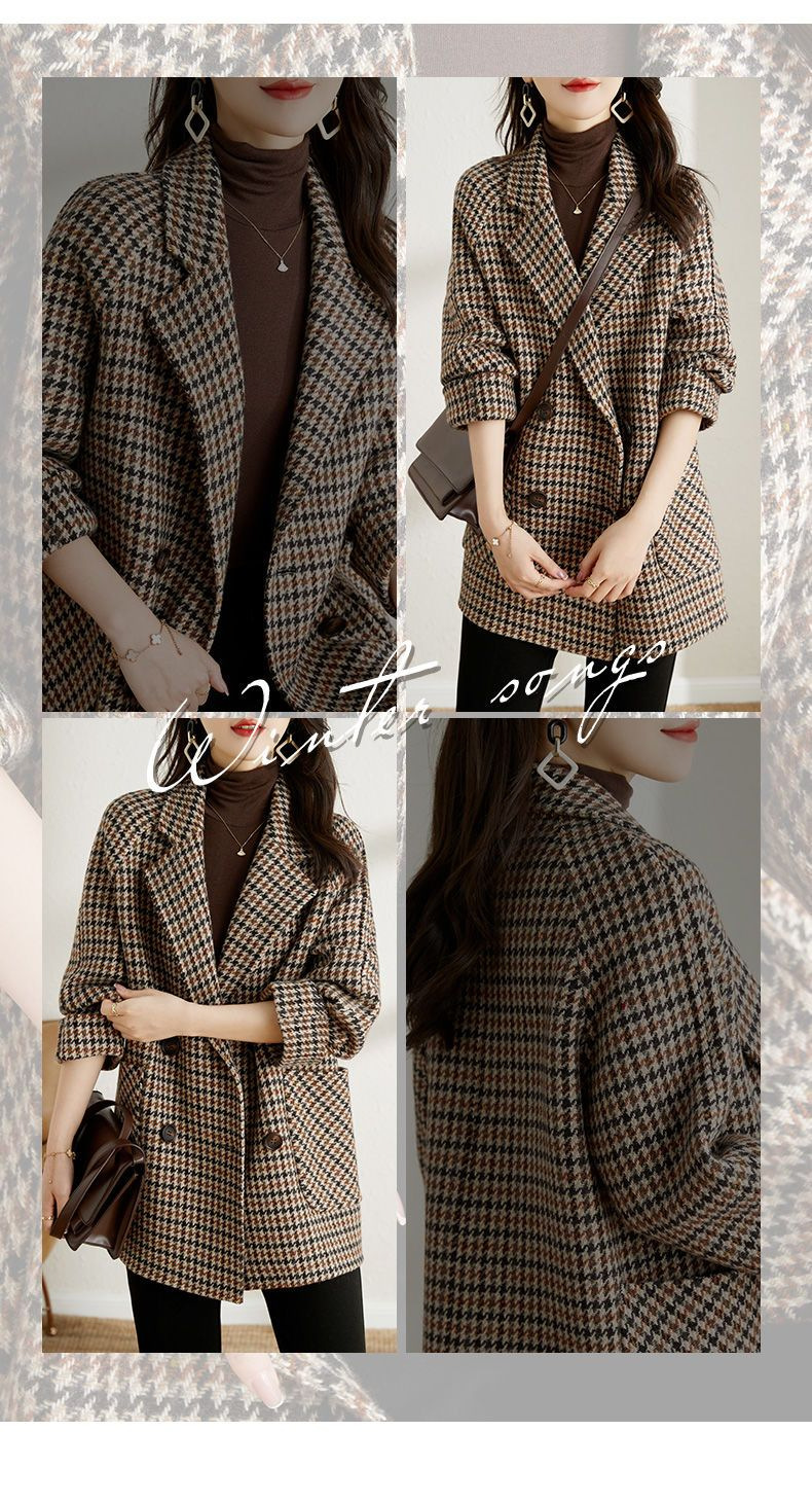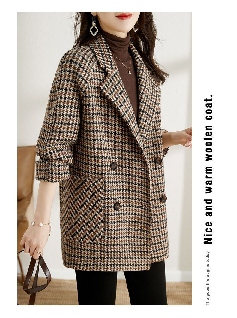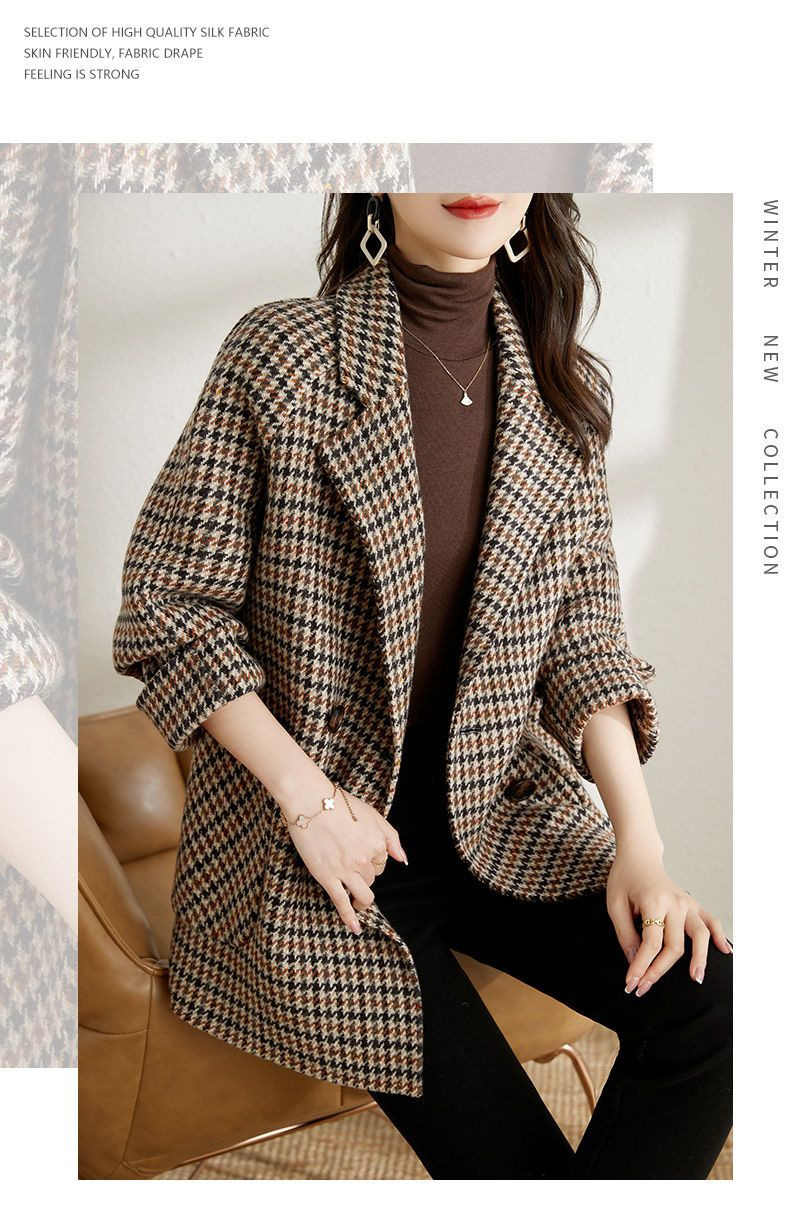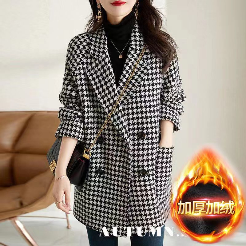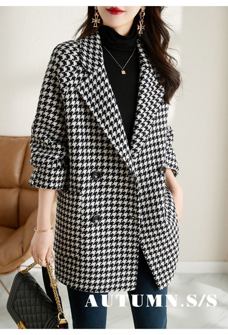 가을과 겨울 새 원피스 칼라 하운드 투스 모직 코트 느슨한 여성 의류 유행 모직 중장 코트스토어 가기