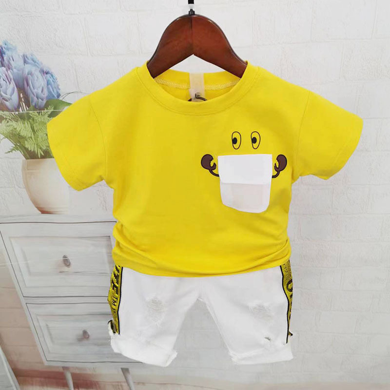• F00112 노란색 티셔츠 + 12172 흰색 찢어진 반바지