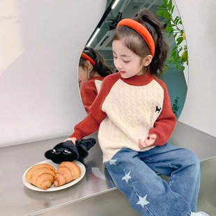 女童毛衣春秋款洋气撞色插肩上衣2024新款韩版秋装儿童针织毛线衣