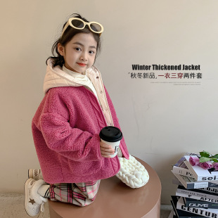女童棉服冬装2024新款儿童冬季羊羔毛外套洋气女孩连帽棉衣两件套