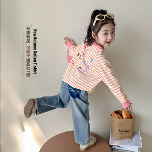 女童秋装长袖T恤2024新款中小童秋季条纹打底衫儿童时髦春秋上衣