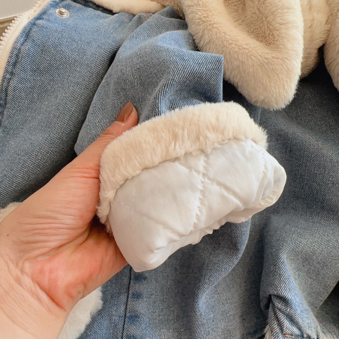 한국 스타일 겨울 여아 데님 재킷 양털 아동복 신상품 중소형 어린이용 두꺼운 옷 귀여운 디자인스토어 가기