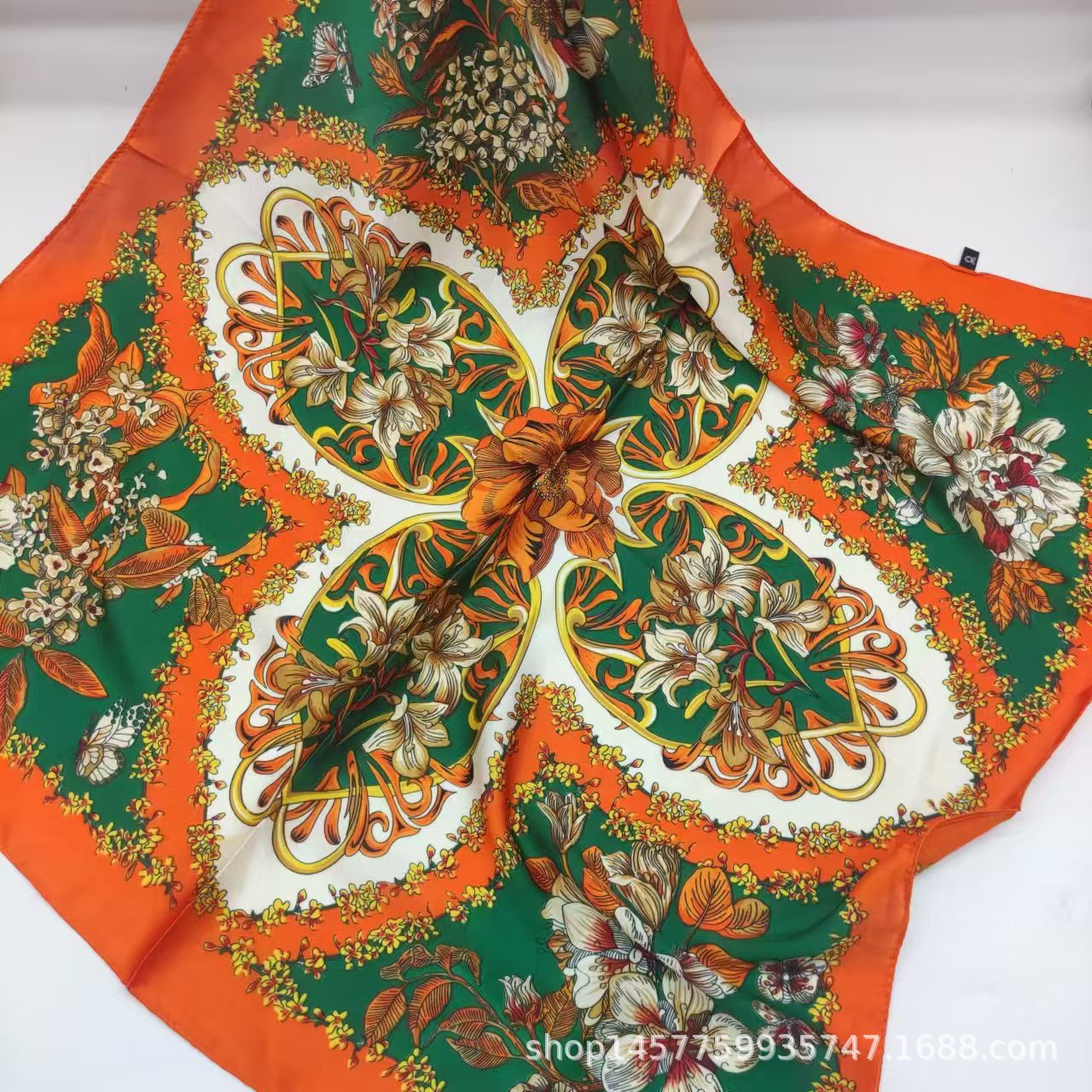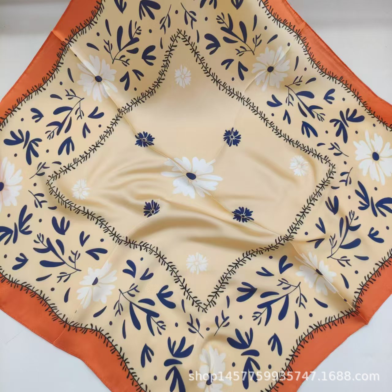• 주황색 배경 녹색 잎 꽃 실크 스카프 작은 사각형 스카프