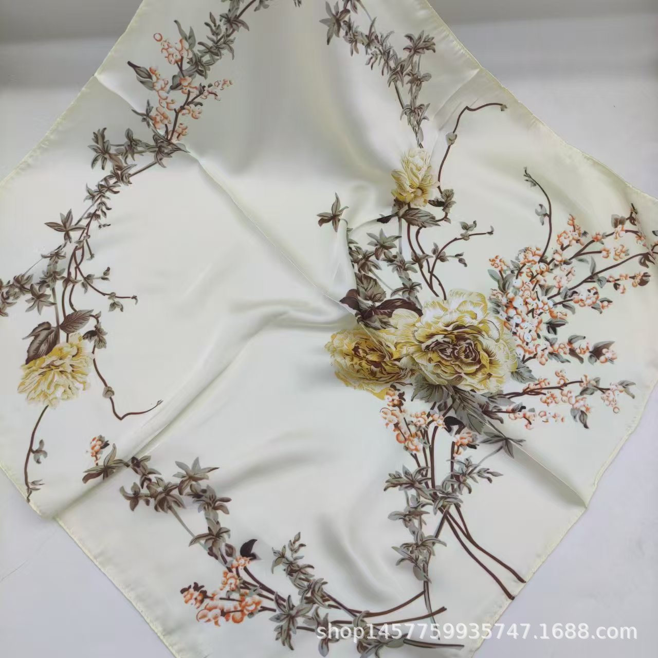 • 화이트 플라워 카키 실크 스카프 스몰 스퀘어 스카프