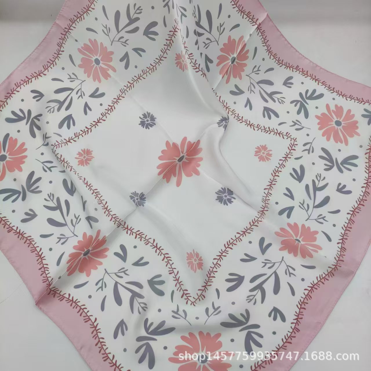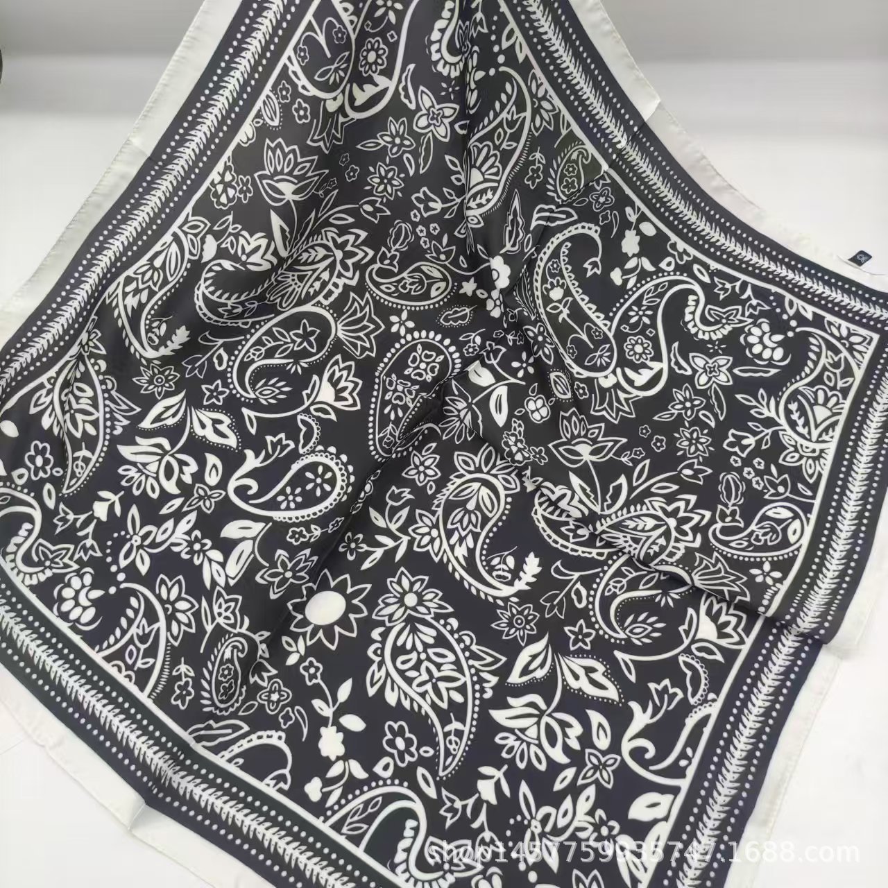 • 회색과 흰색 꽃무늬 실크 스카프 작은 사각형 스카프