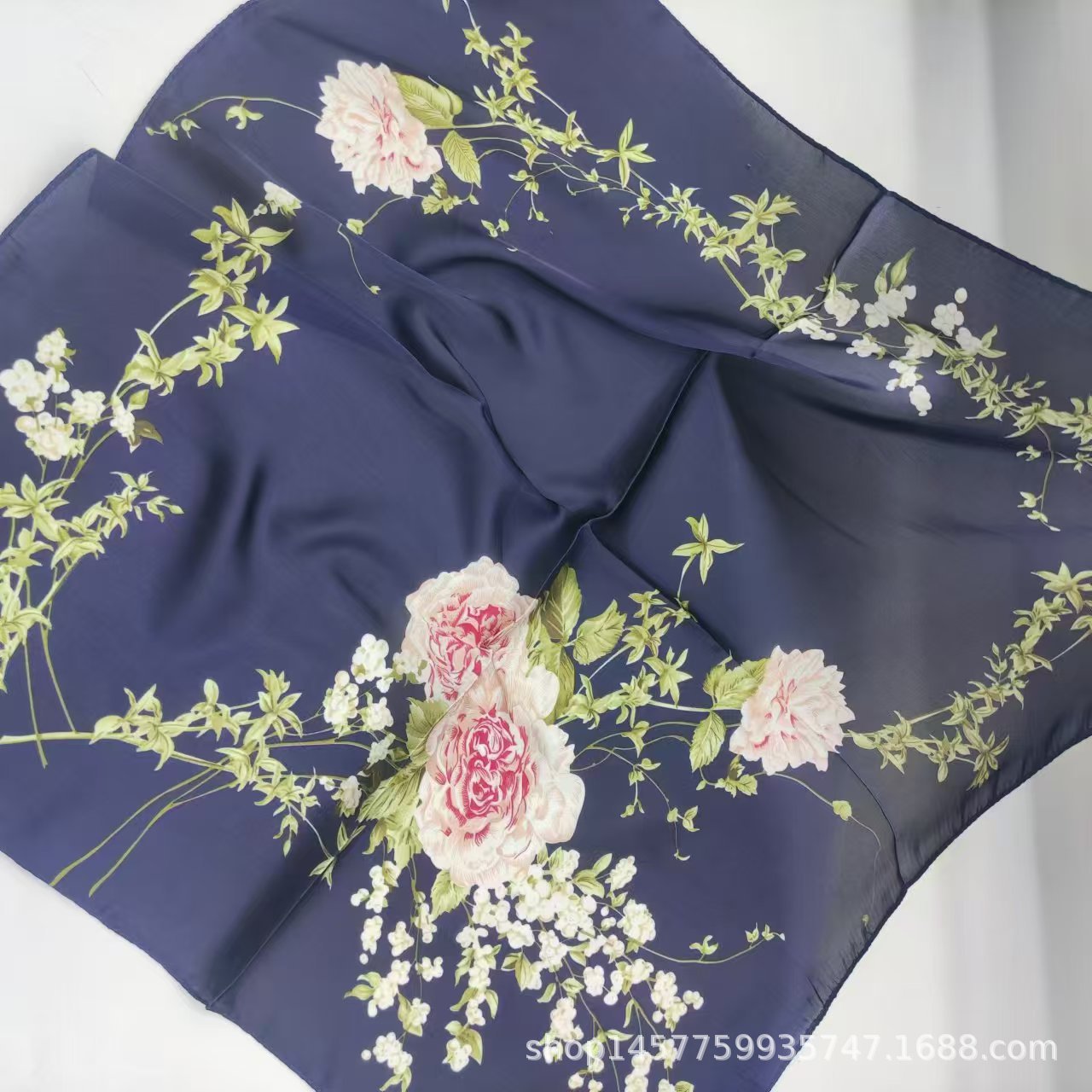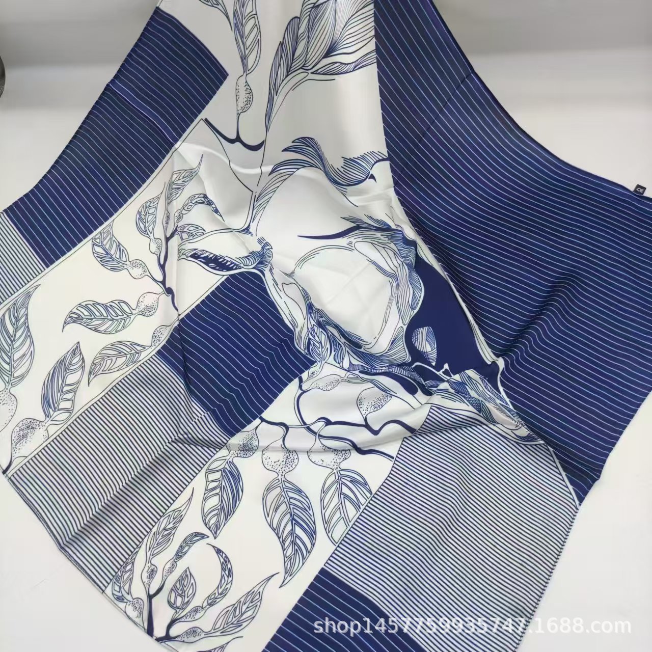 • 네이비 블루 큰 꽃 실크 스카프 작은 사각형 스카프